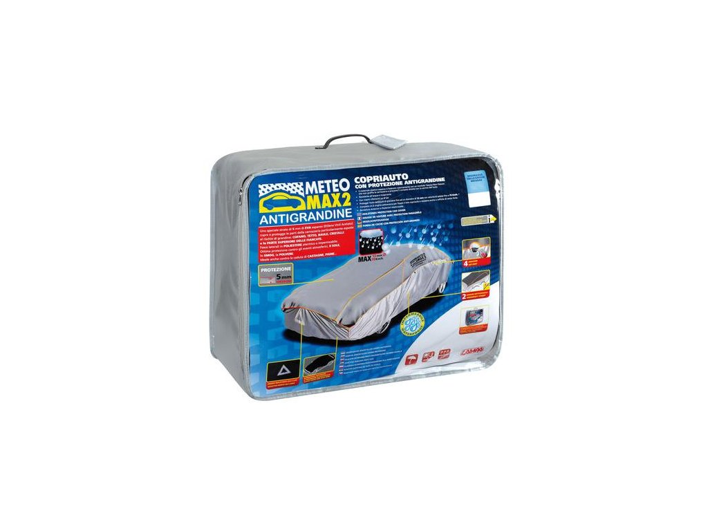 Ochranná plachta na auto proti krupobitiu, na prekrytie celého vozidla. Vysoká odolnosť proti poveternostným vplyvom, vodeodolná. Horná časť vystužená zosilneným materiálom, ktorý dokáže absorbovať nárazy krúp pri krupobití a tým zamedzí poškodeniu vozidla. Jednoduché upevnenie plachty - iba sa nasadí na automobil, na spodku sa upevní časť s všitou gumou za vhodné záhyby karosérie alebo nárazníka a prednú i zadnú časť plachty sa dôkladne upevní pomocou všitých popruhov so sponami. Materiál: špeciálna unikátna 5 mm EVA pena (elytén-vinyl-acetát) Ochrana pri akýchkoľvek klimatických podmienkach, slnko, dážď, smog, veľké množstvo prachu, ktoré chráni aj autá pred padajúcimi predmetmi, ako sú borovicové kužele, gaštany, šupky ... EVA vrstva je lemovaná mäkkou netkanou textíliou, ktorá chráni farbu vozidla pred poškriabaním. Odolná voči vode a priedušná, so silnou odolnosťou proti roztrhnutiu a opotrebeniu. Predné a zadné elastikované spodné lemy. • Zaručene odoláva krupobitiu až do priemeru 12 mm ľadu s rýchlosťou poklesu max. 70 km / h. Balenie obsahuje úložného vreckoRozmer: