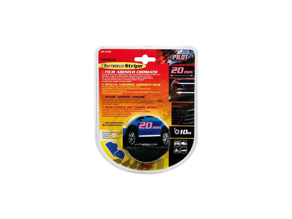 Špeciálny chrómovaný lepiaci film. Ultra tenké, flexibilné, môžu byť zakrivené do tvaru a rozrezané na veľkosti. Špeciálne lepidlo pre bezpečné a dlhotrvajúce uchopenie na akomkoľvek hladkom povrchu. Vhodné pre vnútorné a vonkajšie použitie. Vyrobené pre karosériu auta, zrkadlá, svetlá, skvelé aj na mriežkách chladiča, nárazníky, prístrojové dosky atď. Vrátane frézy a stierky Uvedená cena je za 10 metrov. Šírka: 20 mm Dĺžka: 10 mDodatočné parametre