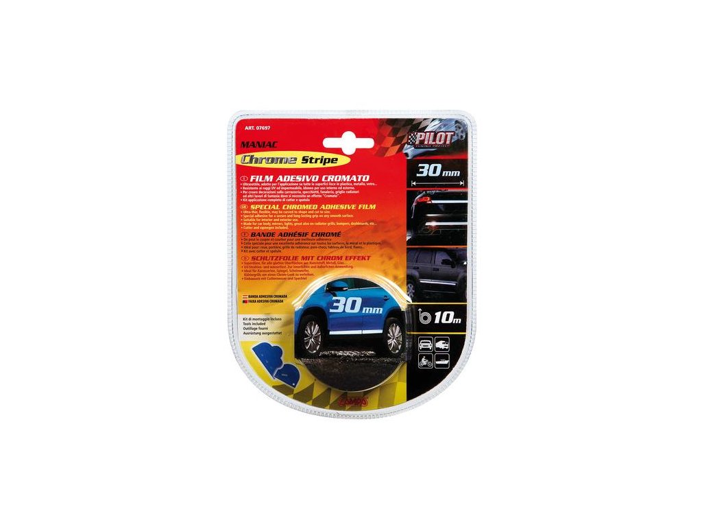 Špeciálny chrómovaný lepiaci film. Ultra tenké, flexibilné, môžu byť zakrivené do tvaru a rozrezané na veľkosti. Špeciálne lepidlo pre bezpečné a dlhotrvajúce uchopenie na akomkoľvek hladkom povrchu. Vhodné pre vnútorné a vonkajšie použitie. Vyrobené pre karosériu auta, zrkadlá, svetlá, skvelé aj na mriežkách chladiča, nárazníky, prístrojové dosky atď. Vrátane frézy a stierky Uvedená cena je za 10 metrov. Šírka: 30 mm Dĺžka: 10 mDodatočné parametre