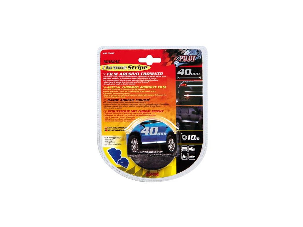 Špeciálny chrómovaný lepiaci film. Ultra tenké, flexibilné, môžu byť zakrivené do tvaru a rozrezané na veľkosti. Špeciálne lepidlo pre bezpečné a dlhotrvajúce uchopenie na akomkoľvek hladkom povrchu. Vhodné pre vnútorné a vonkajšie použitie. Vyrobené pre karosériu auta, zrkadlá, svetlá, skvelé aj na mriežkách chladiča, nárazníky, prístrojové dosky atď. Vrátane frézy a stierky Uvedená cena je za 10 metrov. Šírka: 40 mm Dĺžka: 10 mDodatočné parametre