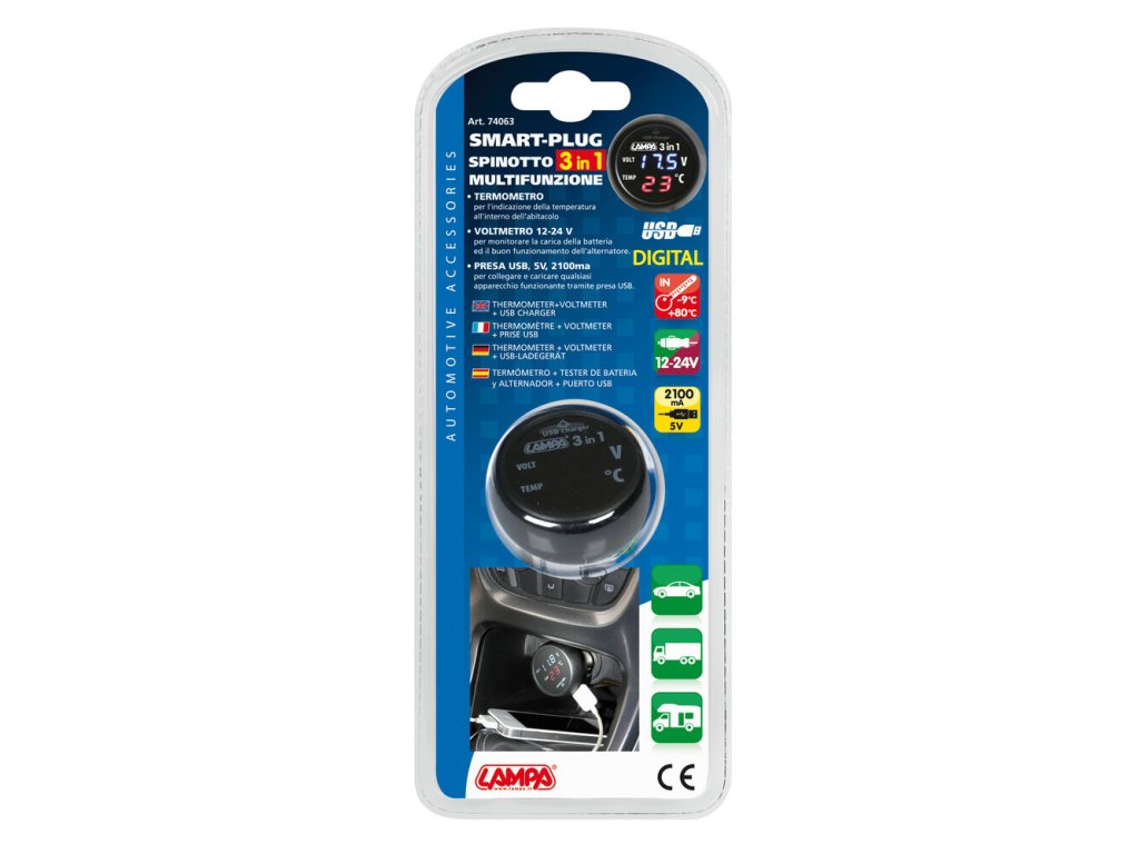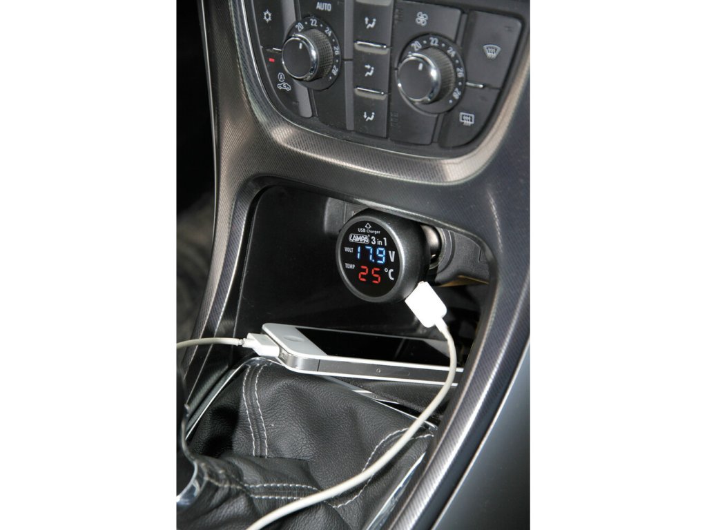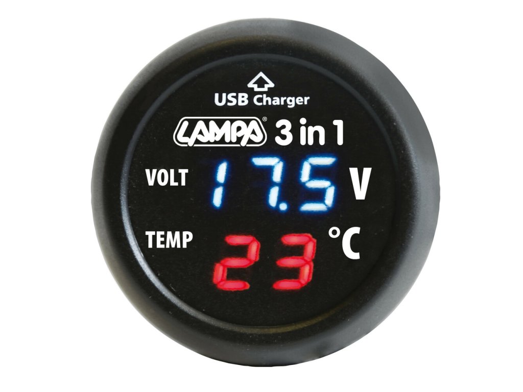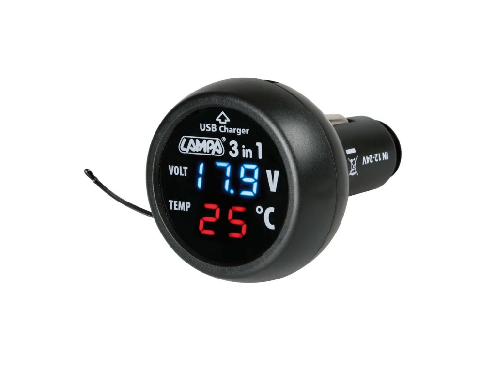 Digitálny voltmeter 12/24V s teplomerom a USB výstupom- Vnútorný teplomer pre osobné a nákladné vozidlo -9 ° C / + 80 ° C