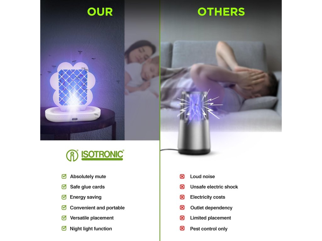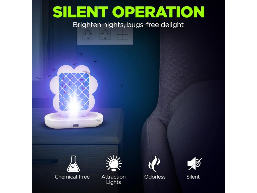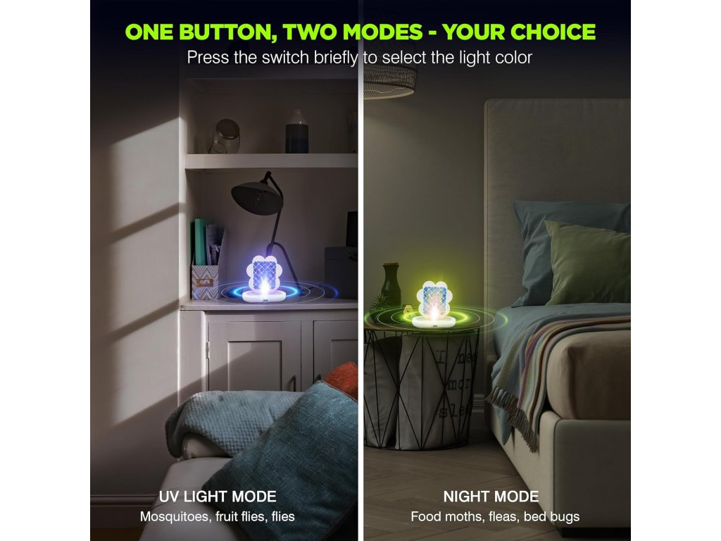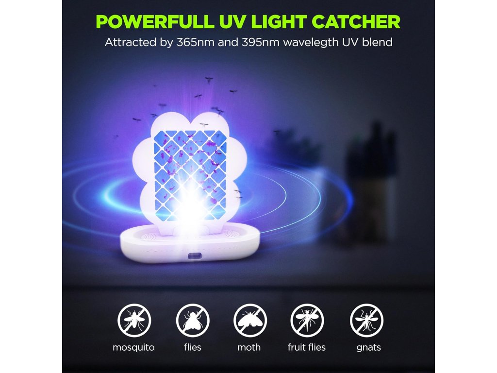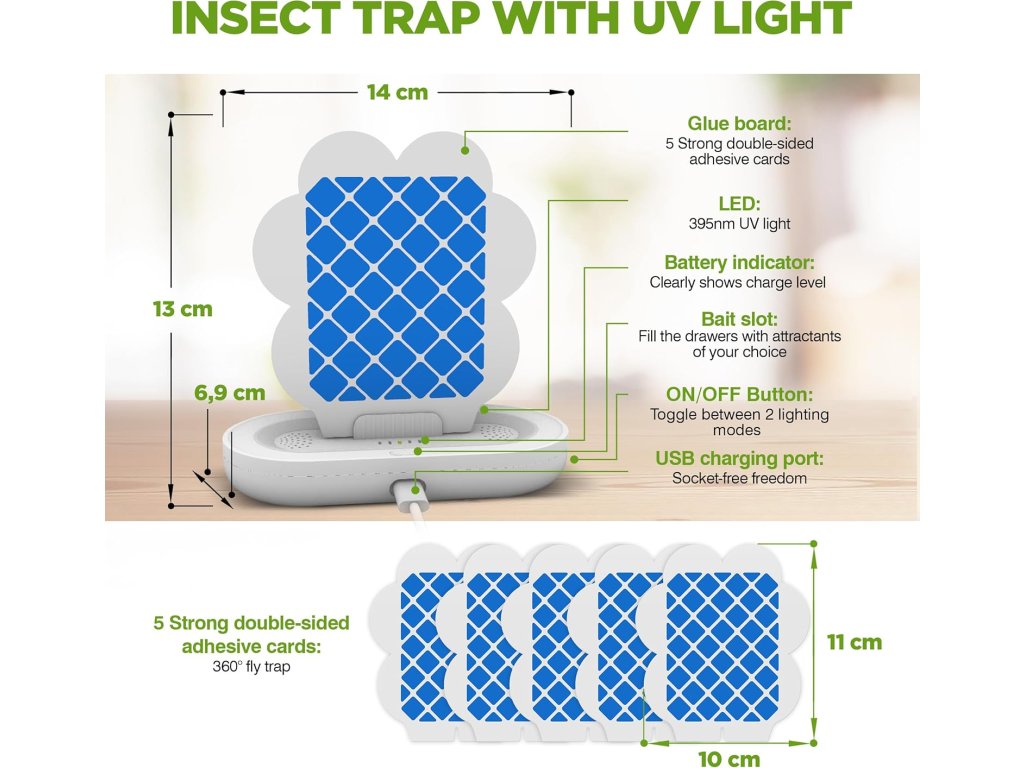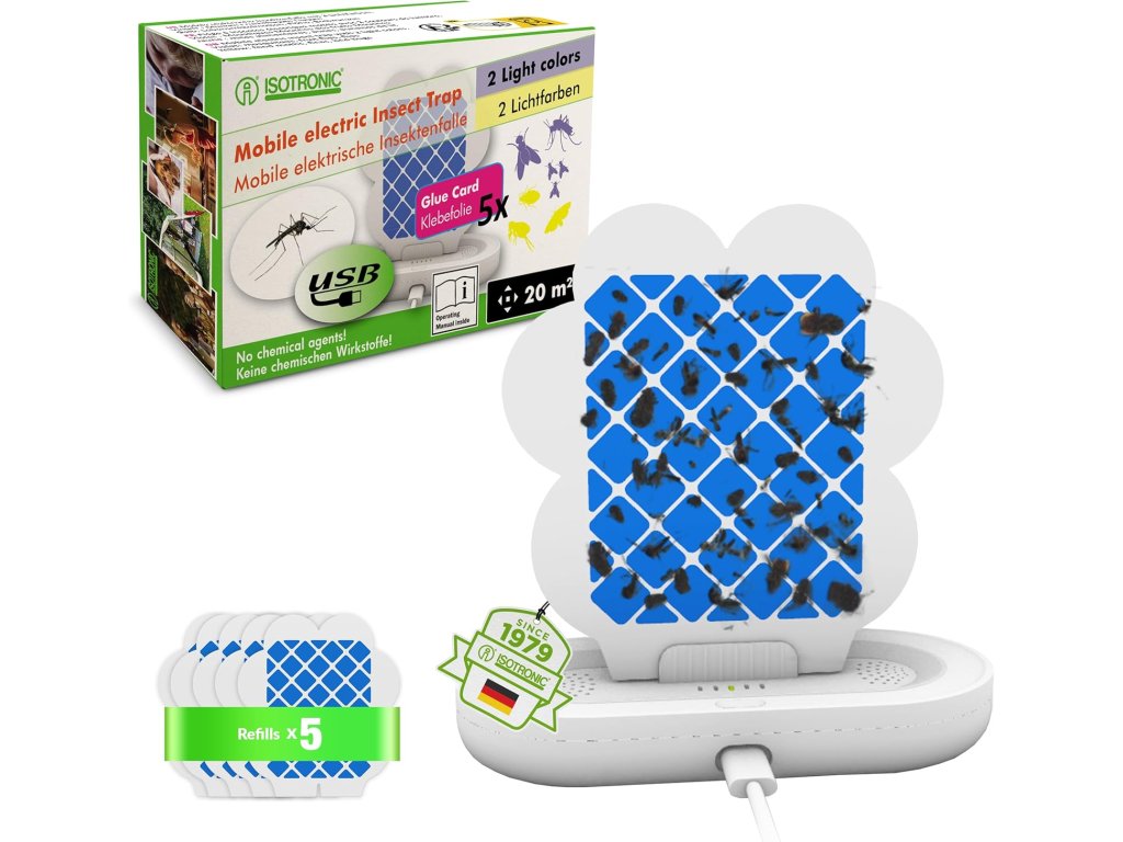 Účinný a dekoratívny pomocník do domácnosti. Tento štýlový a mobilný lapač hmyzu dvojfarebný využíva dve farebné svetlá na účinné prilákanie rôznych druhov lietajúceho hmyzu – komárov, potravinových molí, ovocných mušiek či múch. Hmyz po prilákaní zostáva prilepený na výmennej lepiacej fólii umiestnenej vo vnútri zariadenia.