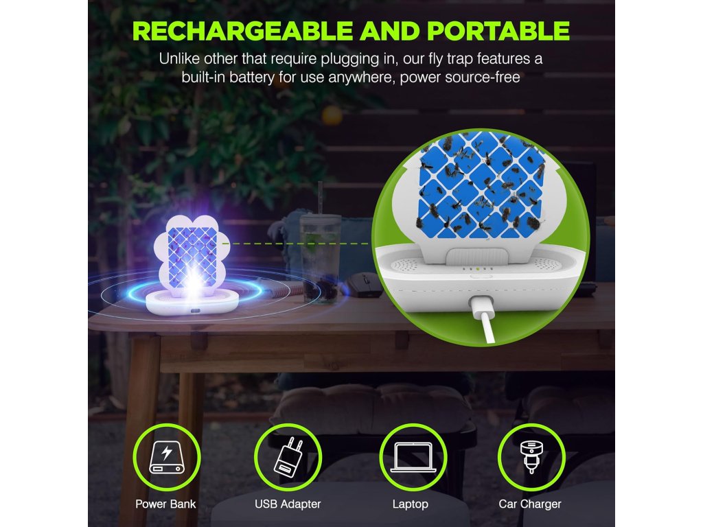 Pred prvým použitím zariadenie úplne nabijete pomocou priloženého USB kábla. Modré LED svetlo zhasne, keď sa batéria plne nabije. Potom odstránite ochranné vrstvy z lepiacej fólie a vložíte ju do otvoru v hornej časti lapača. Do bočných zásuviek pridáte atraktant podľa vlastného výberu – napríklad jablčný ocot na ovocné mušky. Na zapnutie stlačíte tlačidlo na boku zariadenia, kým sa nerozsvieti svetlo. Krátkym stlačením prepínate medzi dvoma režimami: fialové svetlo priláka komáre, ovocné mušky a muchy, žlté svetlo zasa potravinové mole, blchy a ploštice. Lapač hmyzu dvojfarebný vypnete podržaním tlačidla, až kým kontrolka nezhasne.