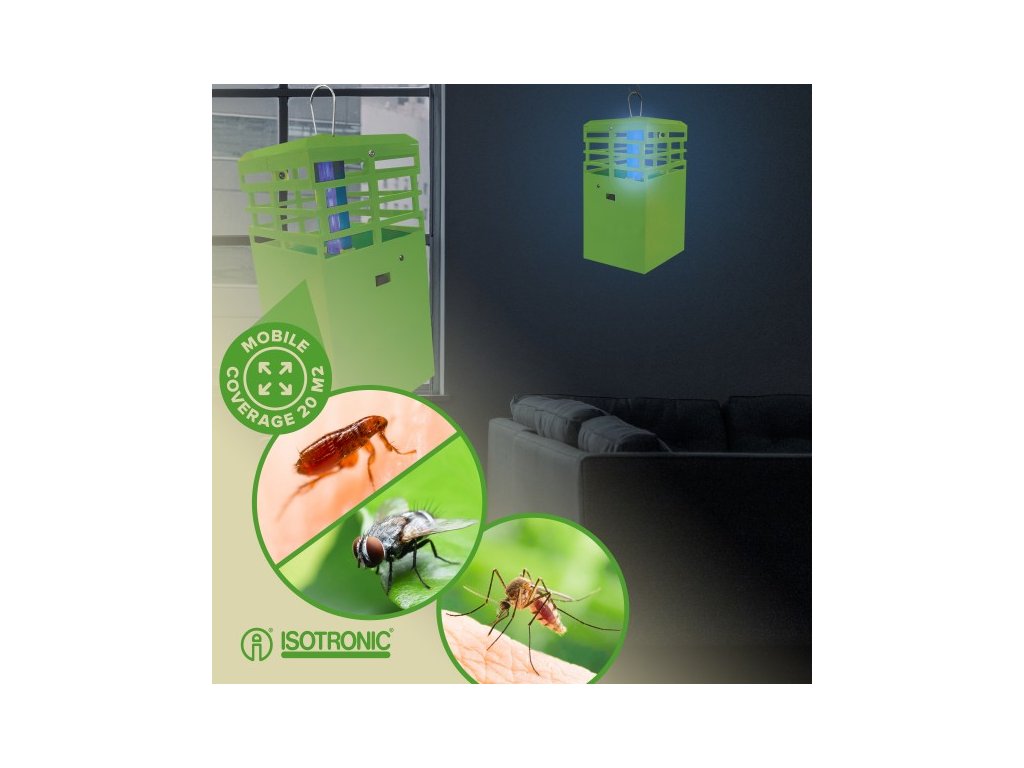 ISOTRONIC lapač hmyzu poskytuje účinnú ochranu pred komármi, ovocnými muškami a ďalším lietajúcim hmyzom. Funguje bez chemikálií, čím nezaťažuje životné prostredie a je bezpečný pre domácnosť. Špeciálne modré svetlo láka hmyz, ktorý sa následne prichytí na lepiacu fóliu umiestnenú vo vnútri prístroja.
