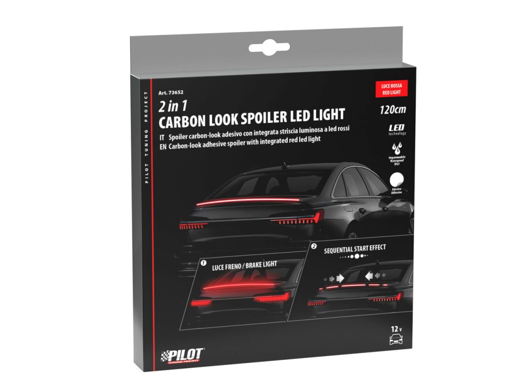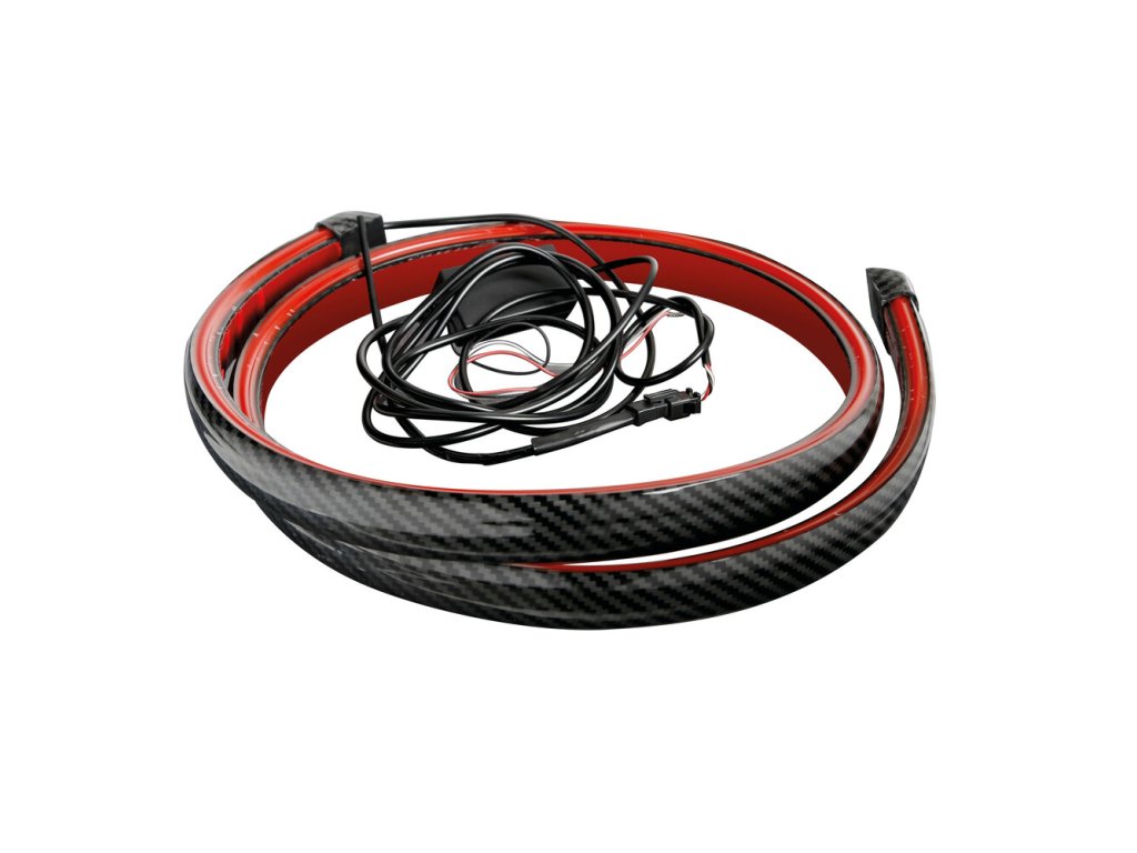 Samolepiaci LED pásik so svetlom na brzdenie – 120 cm, 12V, karbónový vzhľad. Tento štýlový LED pásik brzdové svetlo v karbónovom dizajne kombinuje atraktívny vzhľad s praktickou funkčnosťou. Slúži ako brzdové svetlo so sekvenčným efektom a výrazne zvyšuje viditeľnosť vozidla na cestách. Vďaka tomu prispieva k vyššej bezpečnosti najmä počas zníženej viditeľnosti, za dažďa či v noci.