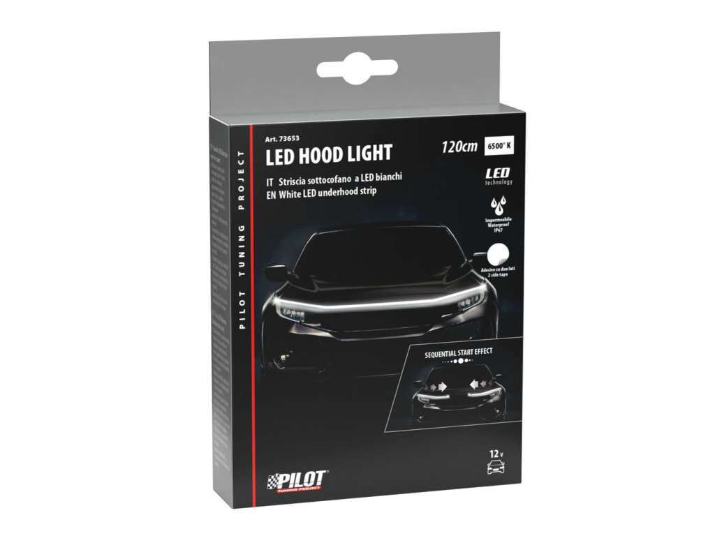 Biela LED páska pod kapotu – 120 cm, 12V – štýlové osvetlenie s dynamickým efektom. Táto 120 cm dlhá biela LED páska predstavuje jednoduchý a moderný spôsob, ako zvýrazniť štýl vášho vozidla a zároveň zlepšiť jeho viditeľnosť. LED pásik samolepiaci na kapotu vďaka sekvenčnému svetelnému efektu vytvára plynulé a dynamické osvetlenie, ktoré okamžite zaujme. Ide o perfektné riešenie pre vodičov, ktorí chcú svojmu autu, SUV, dodávke alebo motocyklu dodať športový a prémiový vzhľad.