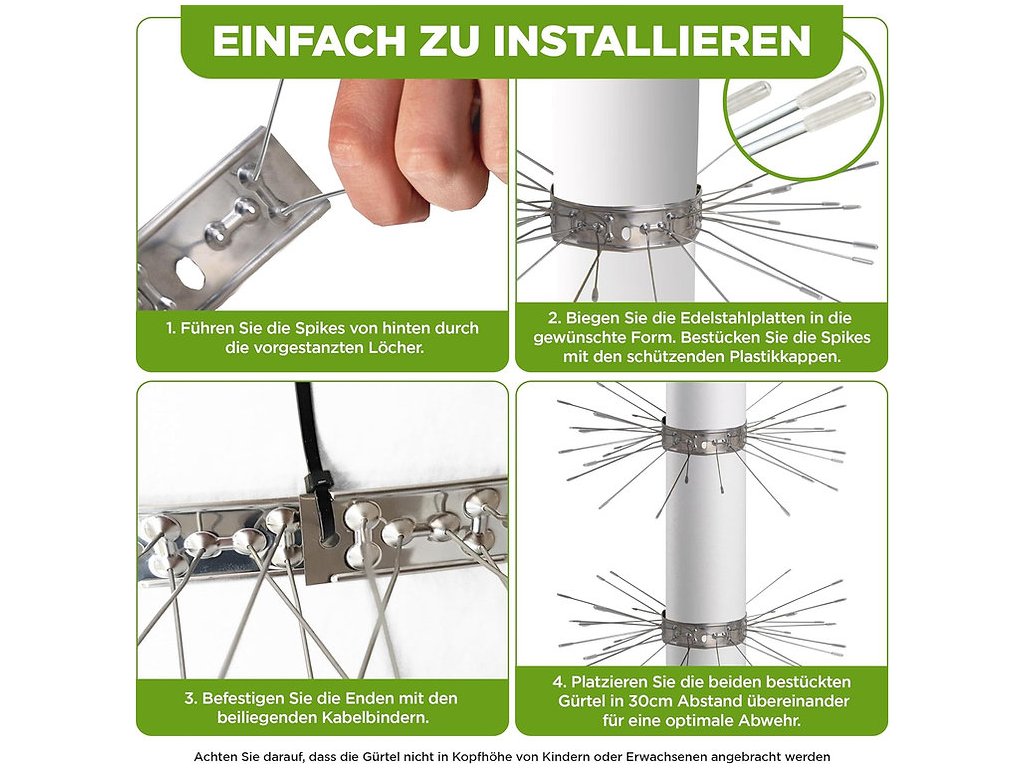 Konštrukcia pásu pozostáva z ohybných nerezových segmentov vybavených hrotmi, ktoré vytvárajú nepríjemnú – no bezpečnú – fyzickú bariéru. Zvieratá tak nemajú možnosť pokračovať v lezení, čím sa účinne predchádza ich prieniku. Navyše, konce hrotov sú opatrené plastovými krytkami, ktoré minimalizujú riziko zranenia, pričom zároveň zachovávajú plnú funkčnosť ochrany. Vďaka tomuto riešeniu zostáva výrobok šetrný k zvieratám aj k životnému prostrediu.