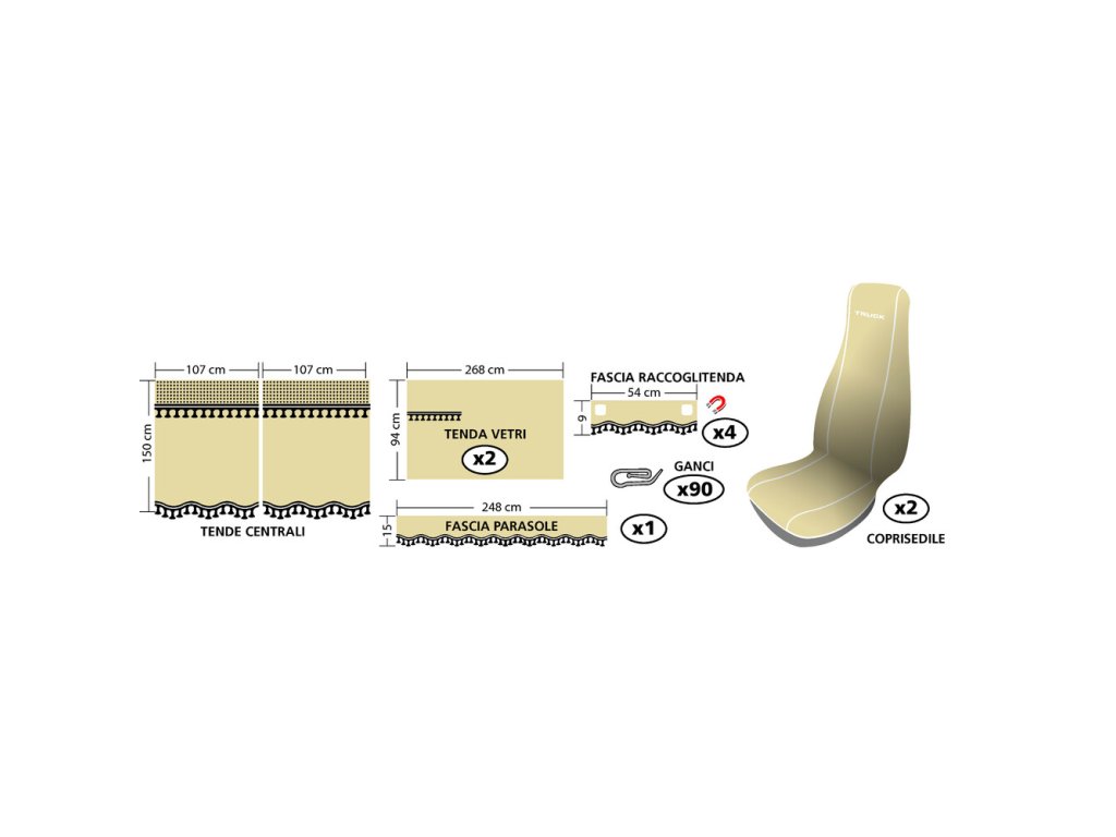 Sada obsahuje: 2 poťahy sedadiel nákladného vozidla, 2 bočné závesy, 2 stredové závesy, 1 hornú záves na čelné sklo, 4 magnetické pásy na zhromažďovanie, 90 plastových háčikov. Hodí sa pre väčšinu nákladných vozidiel so štandardnou kabínou a sedadlomDodatočné parametre