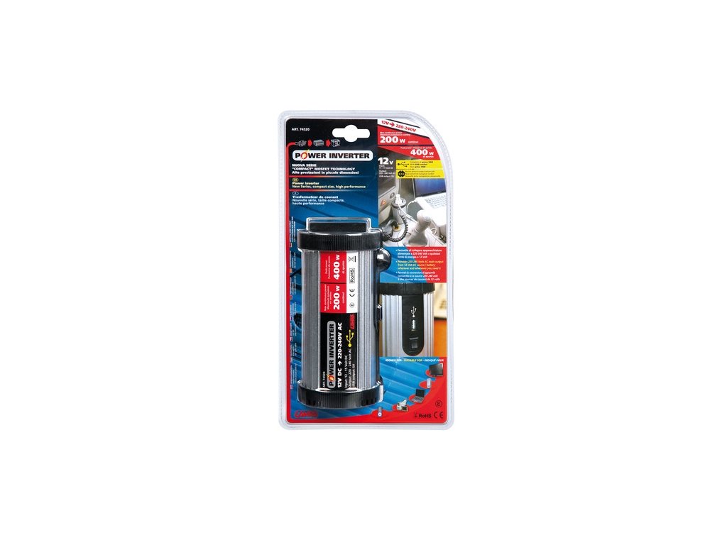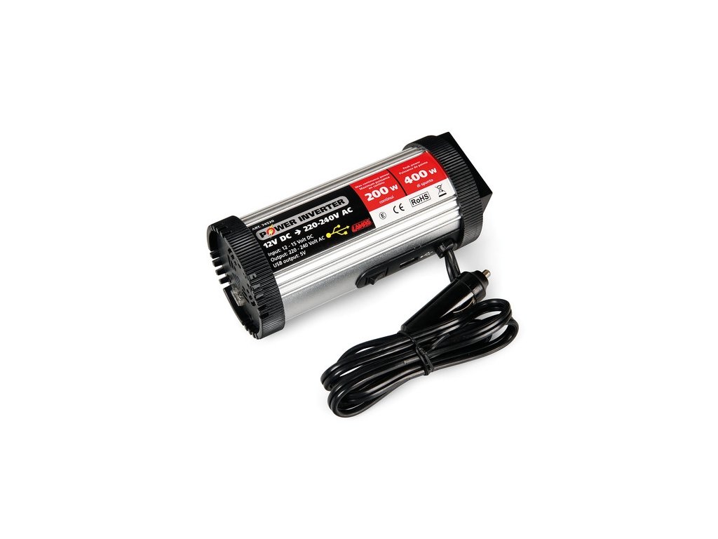 Ideálne pre pripojenie digitálnej kamery, mobilného telefónu, lampy, CD/DVD prehrávača, rádia atď. S týmto prístrojom sa nemusíte obávať výpadku prúdu! Invertor je taktiež vybavený USB výstupom pre napájanie rôznych zariadení s rozhraním typu USB 2.0. Tento výstup nie je určený pre prenos dát. Preto doň nezapájajte žiadne USB káble, zariadenia, alebo prehrávače. Prístroj obsahuje ochranu proti opačnej polarite, nízkemu/vysokému napätiu, skratu, preťaženiu, prehriatiu a vysokému či nízkemu napätiu batérie. • štandardný model pre každodenné použitie kdekoľvek na cestách • Zvlnenie výstupného napätie má tvar modifikovanej sínusoidy • Ochrana proti prehriatiu, skratom, prepätiu, preťaženiu a vybitiu batérie • Celokovové telo zaručujúce dostatočné odvetrávanie • originálna farba výrobku • USB 2.0 nabíjací výstup 800mA Forma vlnenia: modifikovaná jednoduchá vlna. Zabezpečuje 220-240V AC napätie zo zdroja 12V DC. Hliníkový obal pre dlhšiu životnosť. Zabezpečuje konštantne vysoký výkon pri dvojnásobnej špičke. Pokročilý obvod, ktorý umožňuje zvládnuť aj zapínanie a vypínanie spotrebičov. Vstupné napätie: 11—15V DC, výstup AC 220—240V Ochrana pred skratom, prepätím, nadmerným odberom, prehriatím.Dodatočné parametre