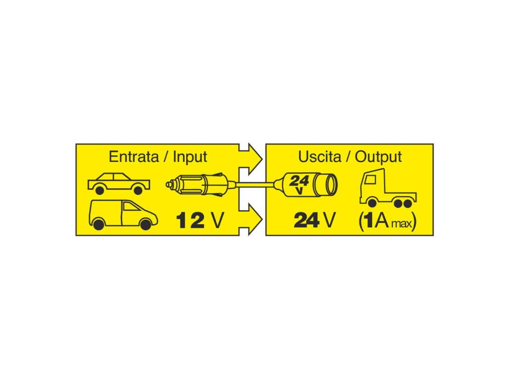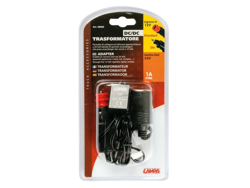 Napájací adaptér so zásuvkou zapaľovača 12 V DC až 24 V DC Umožňuje pripojiť spotrebiče napájané 24 V cez zásuvky 12V zapaľovača cigariet. Maximálny výstup 1A.Dodatočné parametre