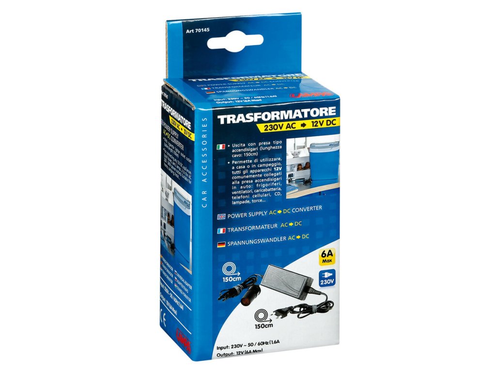 Menič napätia z 220-240V na 12V Na pripojenie akýchkoľvek spotrebičov 12V DC (chladiace skrinky, ventilátory, žiarovky ...) k sieťovým zásuvkám 220-240V. Vhodné pre domácnosť, kempovanie ... 350 cm kábel Vstup: 220 - 240 V - Výstup: 12V - 5,8 A.Dodatočné parametre