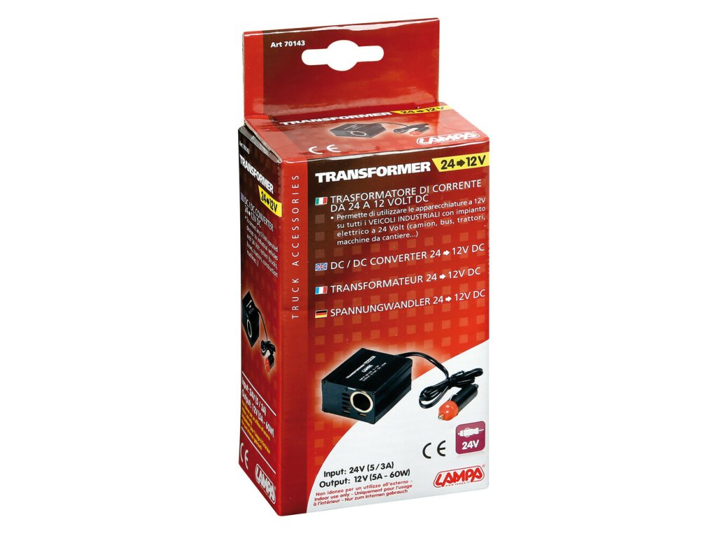 Menič napätia z 24V DC na 12V DC 5/3A 80 cm napájací kábel so zástrčkou a zásuvkou zapaľovača cigariet. Na pripojenie akýchkoľvek zariadení napájaných 12V (chladiace boxy, ventilátory, svetlá ...) k vozidlám so systémom 24VDodatočné parametre