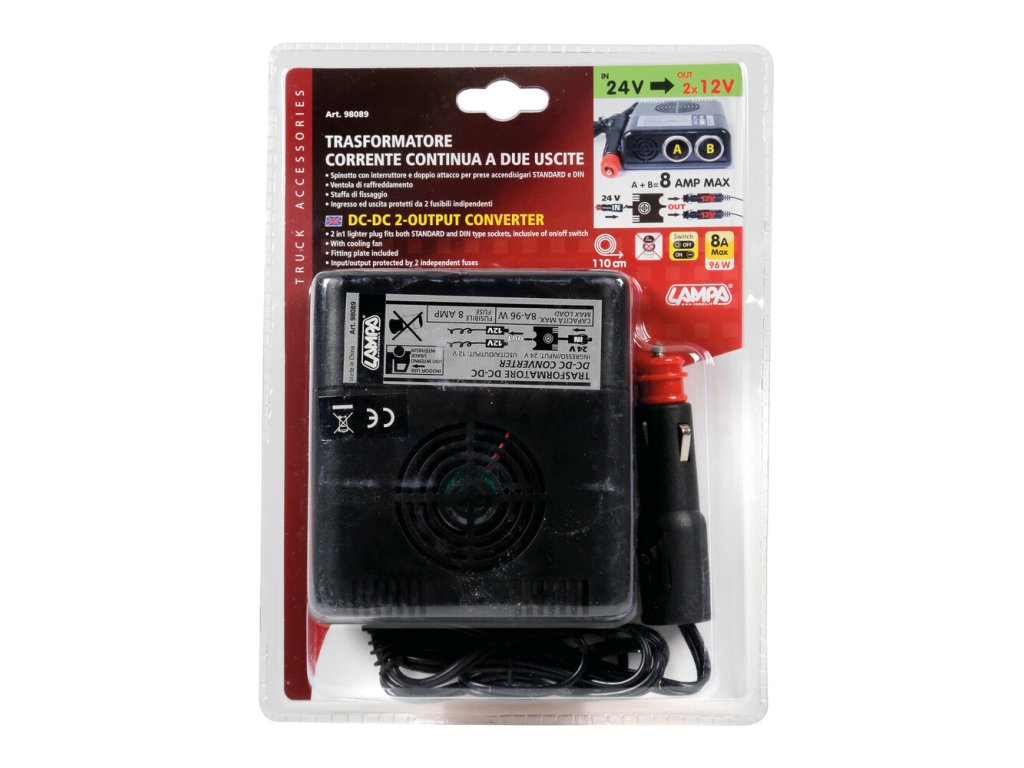 Transformátor s dvoma výstupmi 24V, 12V - 8A Konvertuje z 24V zapaľovacej zásuvky na dva výstupy 12V. Obsahuje chladiaci ventilátor a montážnu podložku. Vhodný na štandardnú ako aj nemeckú zásuvku. Vstup/výstup sú opatrené poistkou.Dodatočné parametre