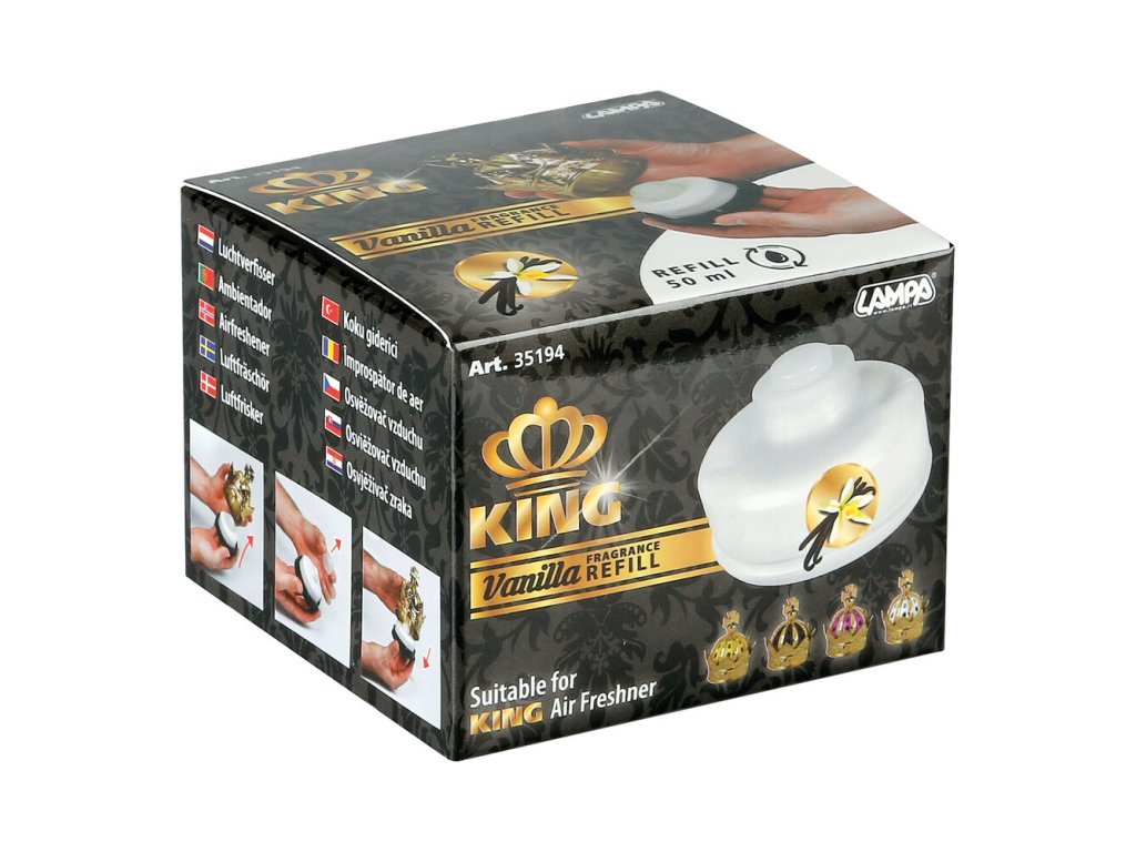 Dopraj svojmu autu, kancelárii alebo domácnosti závan sviežosti s vôňou vanilky. Táto prémiová Náplň do osviežovača vzduchu KING - Vanilka v sebe spája eleganciu, kvalitu a možnosť regulácie intenzity vône presne podľa tvojich predstáv.