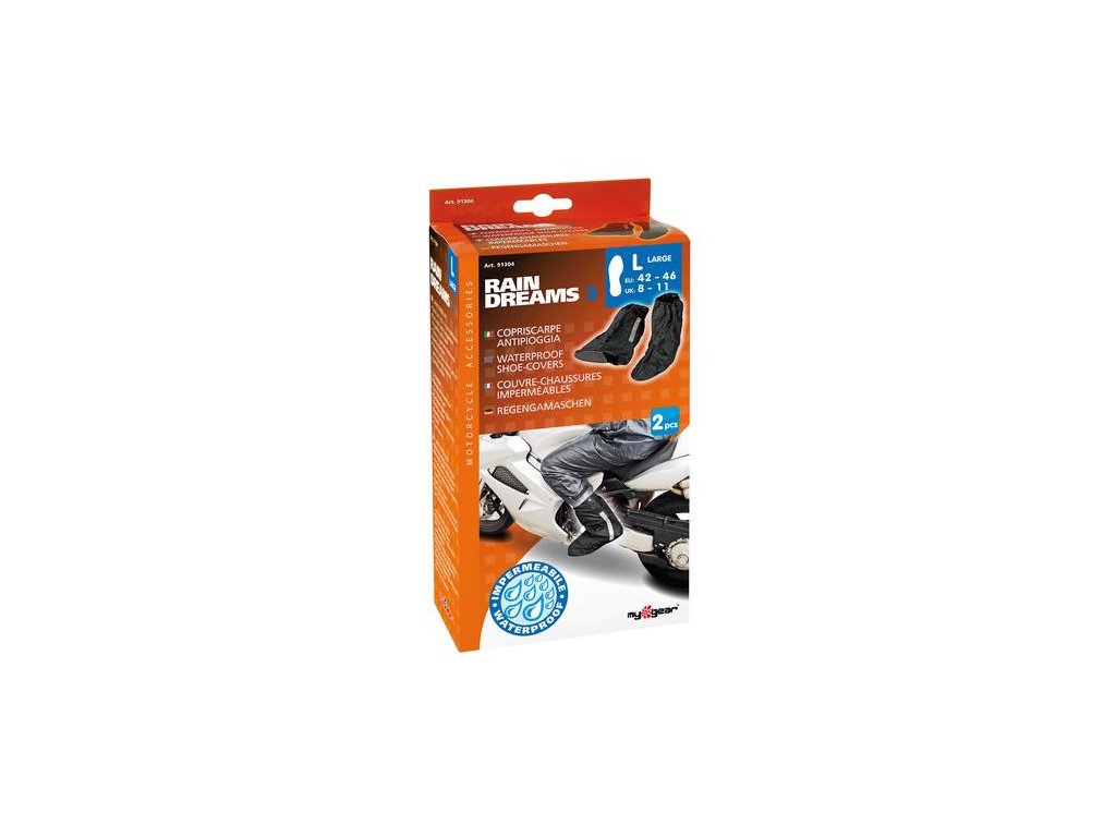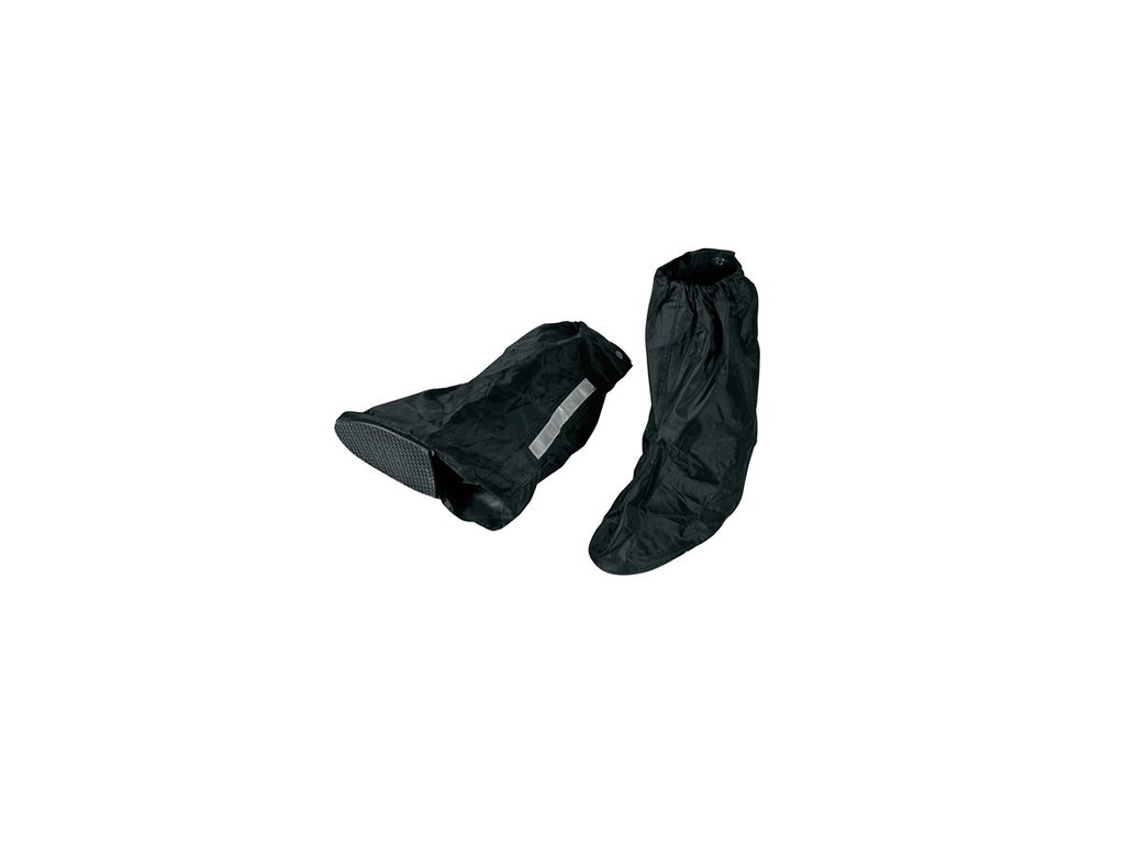 Nepremokavé návleky na obuv vyrobené so špeciálnymi termoplastovými pásikmi a s reflexnými prvkami. Materiál: PVC a nylon Veľkosti: L ---> EU: 42 - 46 ----> UK: 8 - 11 Pokyny k používaniu:- Návleky sú určené na používanie len počas doby nevyhnutnej na chránenie sa pred dažďom počas jazdy na motocykli. Nesmú byť používané ako návlek na obuv počas chôdze. Ich podrážka nie je tomu prispôsoboená. Takéto poškodenie nie je kryté zárukou, ktorú dáva výrobca na vady produktu.