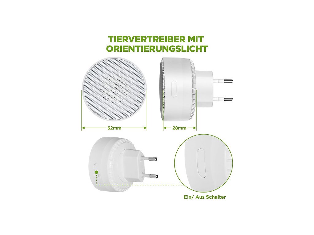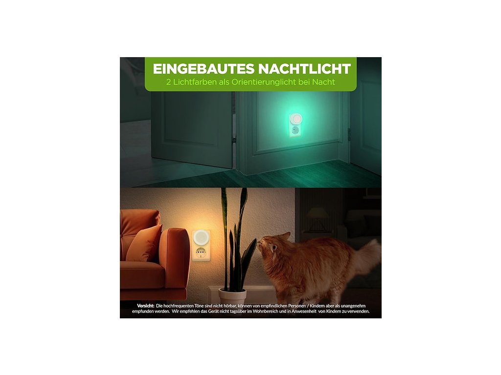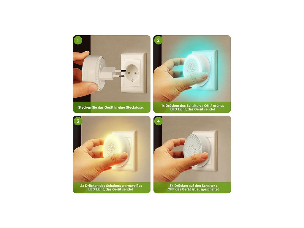 Zariadenie stačí zapojiť do elektrickej zásuvky – okamžite začne vysielať ultrazvukové signály. Nepotrebuje žiadne chemikálie ani jedy, takže neohrozuje ľudí, domáce zvieratá ani životné prostredie. Praktický vypínač ON/OFF a orientačné svetlo v dvoch farbách zabezpečia pohodlné používanie aj v tmavších miestnostiach.