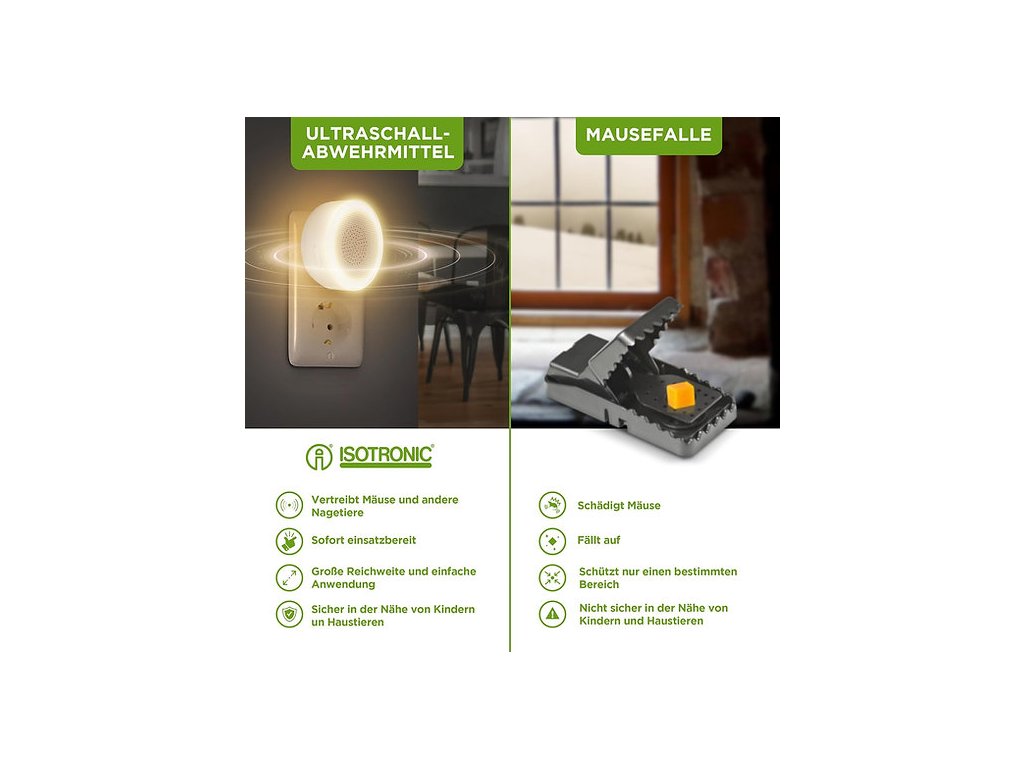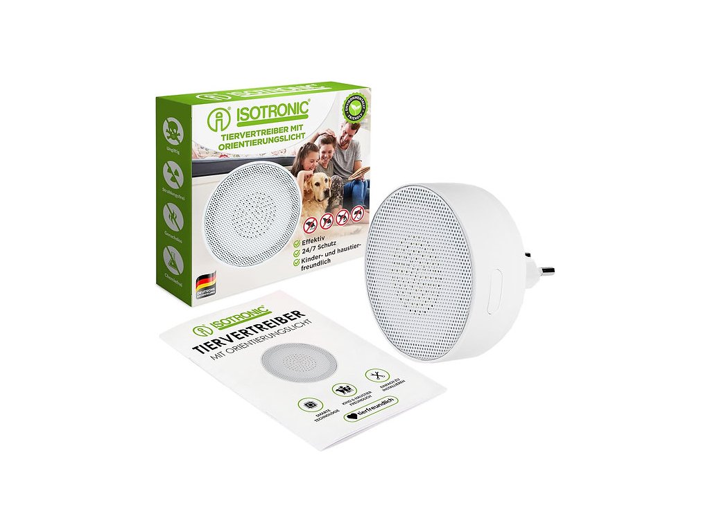 ISOTRONIC Odpudzovač hlodavcov do zásuvky – účinná a ekologická ochrana bez chémie. Myši, potkany, kuny či plchy často prenikajú do pivníc, garáží alebo podkroví, kde spôsobujú škody a narúšajú pohodlie. ISOTRONIC odpudzovač využíva ultra vysoké tóny, ktoré sú pre hlodavce nepríjemné a nútia ich opustiť priestor. Zvuky sa striedajú v intervaloch (3 sekundy zapnuté, 3 sekundy vypnuté), čím sa zabráni tomu, aby si zvieratá na signál zvykli.
