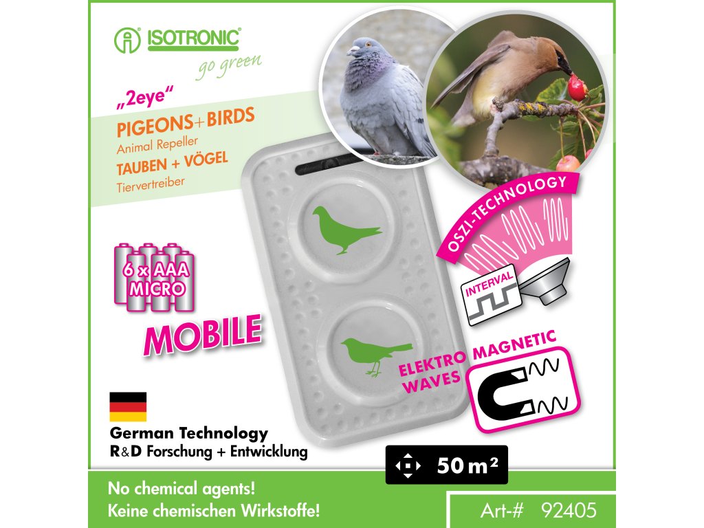 ISOTRONIC odpudzovač holubov a vtákov spoľahlivo chráni balkóny, záhrady, podkrovia a stodoly pred neželanými návštevami vtákov. Vysokofrekvenčné ultrazvukové signály v kombinácii s elektromagnetickými vlnami vytvárajú pre vtáky nepríjemné prostredie, čím ich odrádzajú od pobytu v chránenom priestore. Intervalový režim mení smer a intenzitu signálov, čo zabraňuje tomu, aby si vtáky na zvuk zvykli.