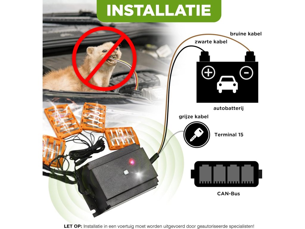 Montáž tohto odpudzovača je rýchla a nenáročná. Stačí ho umiestniť do motorového priestoru alebo na miesta, kde by mohli vniknúť kuny či myši. Je dôležité zabezpečiť, aby ultrazvukové signály neblokovali žiadne prekážky, keďže sa šíria podobne ako svetlo. Okrem toho, v súlade s platnými európskymi predpismi, musí byť zariadenie aktívne len vtedy, keď je motor vypnutý. Tento bezpečnostný prvok pomáha chrániť elektroniku vozidla a zároveň zabezpečuje optimálnu ochranu.Technické parametre