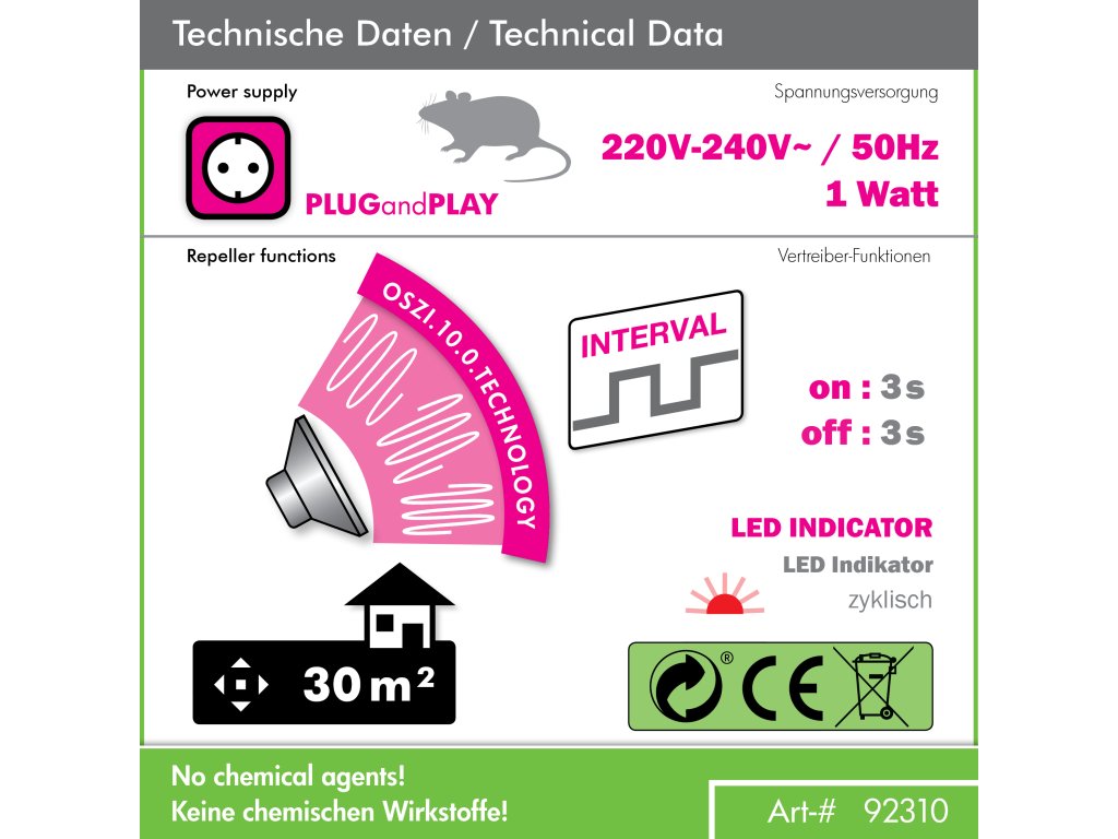 Tento ultrazvukový odpudzovač chráni vašu domácnosť bez škodlivých chemikálií. Pre maximálnu účinnosť odporúčame nepretržitú prevádzku.