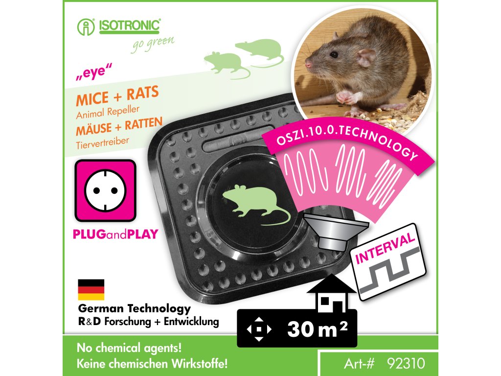 ISOTRONIC odpudzovač myší a potkanov využíva ultrazvukové vlny, ktoré hlodavcom spôsobujú dezorientáciu. Zvuk s frekvenciou 12 – 24 kHz im znemožňuje navigáciu, a preto rýchlo opúšťajú chránený priestor. Tento ekologický spôsob ochrany nevyžaduje použitie chemických látok, čím zabezpečuje bezpečnosť pre domácnosť.