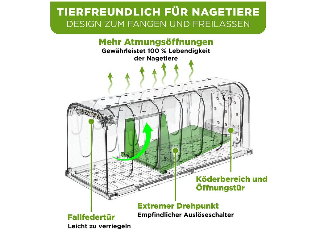Správne umiestnenie zvyšuje úspešnosť odchytu. Pasca najlepšie funguje pri stenách alebo v miestach, kde myši pravidelne prechádzajú. Keď myš vstúpi dnu, spustí pedál a dvierka sa okamžite zatvoria. Vetracie otvory zabezpečujú dostatok vzduchu, čím sa minimalizuje stres pre chytenú myš. Pascu kontrolujte pravidelne, aby sa zabránilo dehydratácii hlodavca.