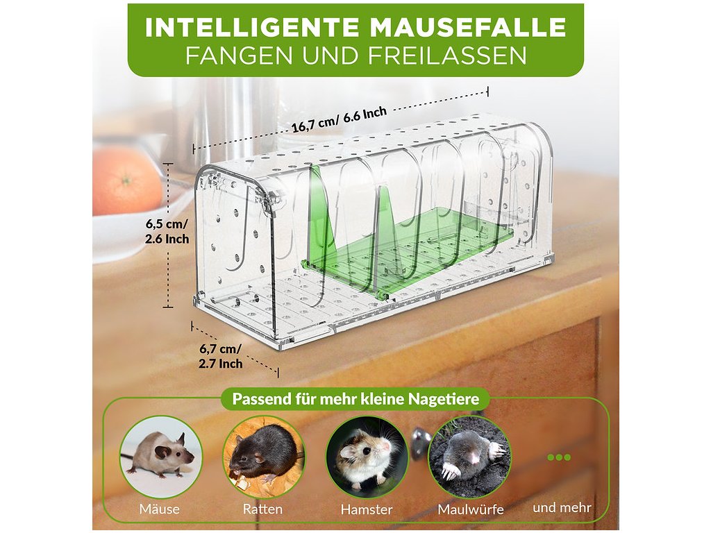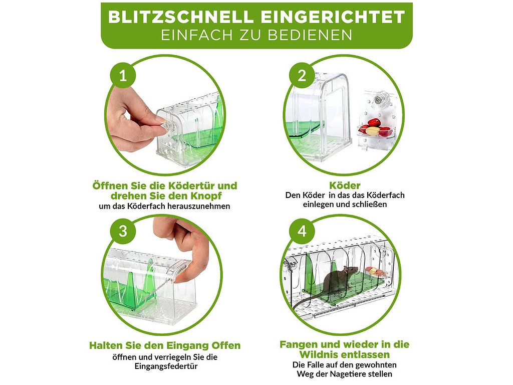 Po odchyte pascu odneste ďalej od obývaných priestorov a myš vypustite do bezpečného prostredia. Po vyčistení ju môžete opäť použiť, čím sa pasca stáva ekologickým riešením na dlhodobú kontrolu hlodavcov.
