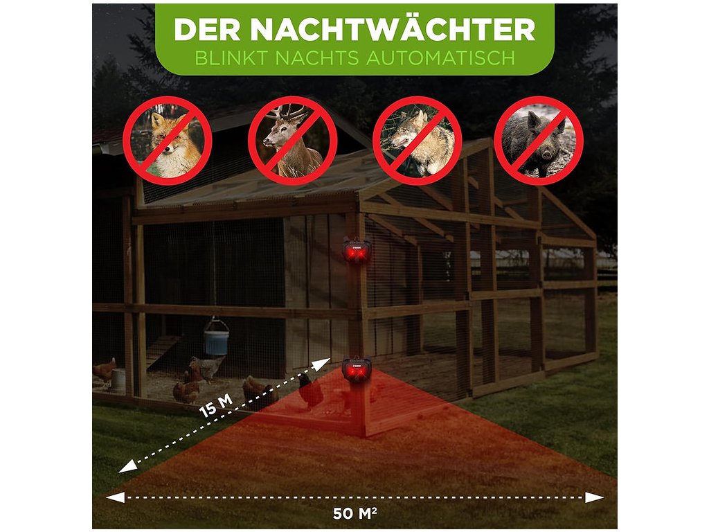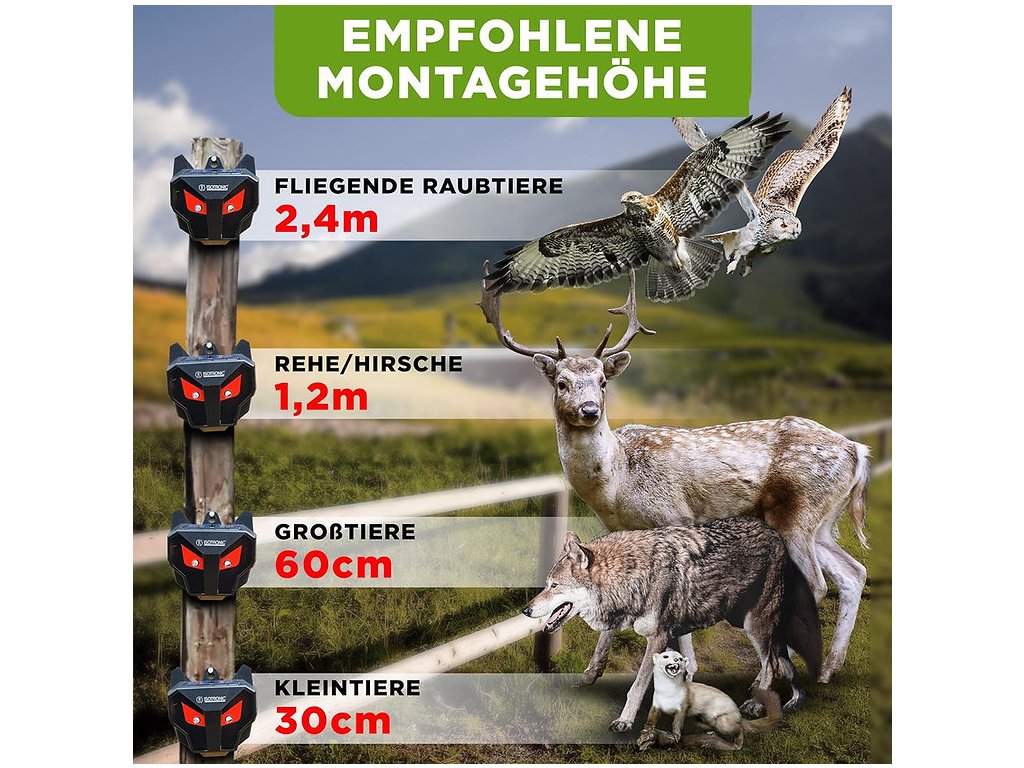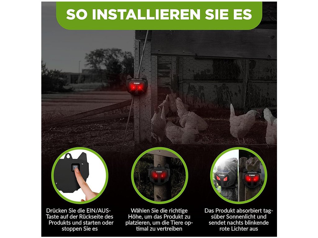 Solárne napájanie zabezpečuje nepretržitú prevádzku bez potreby výmeny batérií. Počas dňa solárny panel nabíja vstavanú batériu, ktorá umožňuje funkčnosť svetla aj v prípade slabšieho slnečného žiarenia. Inštalácia je rýchla a jednoduchá – stačí odpudzovač zapnúť a umiestniť do výšky očí zvierat, aby bol účinok čo najefektívnejší. Najlepšie výsledky dosiahnete upevnením zariadenia na plot, strom alebo drevenú palicu, pričom ho nasmerujete na miesta, odkiaľ zvieratá prichádzajú.