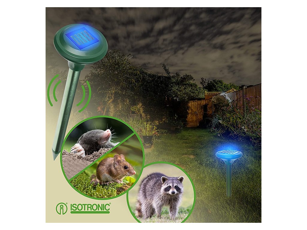 Plašič krtkov, hlodavcov, mravcov, plazov a divej zveri s modrým svetlom je moderné zariadenie navrhnuté na ochranu záhrad, polí, golfových ihrísk a podobných vonkajších priestorov pred nechcenými zvieratami. Tento prístroj využíva kombináciu ultrazvukových frekvencií, zemných vibrácií a modrého LED svetla na efektívne odplašenie rôznych druhov škodcov.