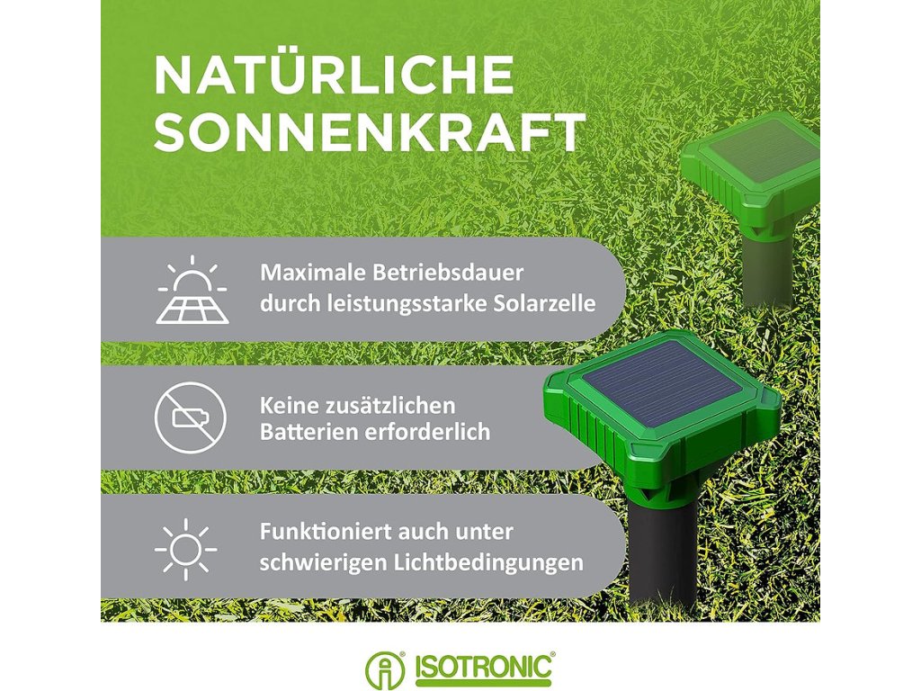 Tento odpudzovač funguje na solárnu energiu, čo znamená, že nepotrebuje žiadne batérie ani externé napájanie. Vstavaná batéria uchováva dostatok energie, aby odpudzovač mohol pracovať až 6 dní bez priameho slnečného žiarenia. Vodotesná konštrukcia s krytím IP65 zabezpečuje spoľahlivú prevádzku aj pri daždi či nepriaznivom počasí.