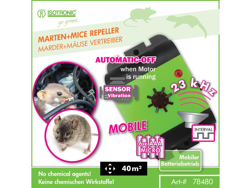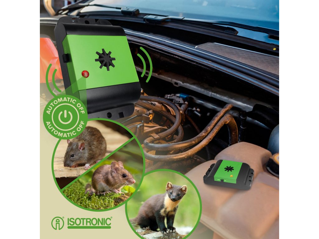 Plašič ISOTRONIC vydáva vysokofrekvenčné zvuky, ktoré kúny a myši vímajú ako varovné signály. Tieto zvuky im signalizujú nebezpečenstvo, čo ich motivuje vyhľadávať iné miesto na pobyt. Časové intervaly zároveň zabraňujú zvieratám zvyknúť si na zvuk, čo zaisťuje dlhodobú účinnosť. Prístroj je ideálny na použitie v aute, dome, garáži, stodole, podkroví alebo altánku. Keďže funguje na batérie, nie je potrebné žiadne napájanie ani elektroinštalácia.Jednoduchá montáž a použitie