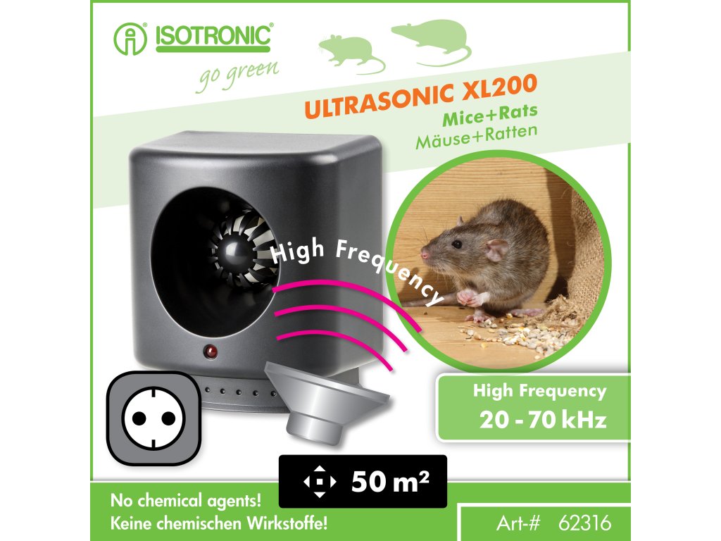ISOTRONIC ULTRASONIC XL 200 efektívne odpudzuje myši, potkany a ďalšie hlodavce pomocou ultrazvukových frekvencií. Hlodavce opúšťajú chránený priestor, pretože vysokofrekvenčný zvuk narúša ich správanie a spôsobuje im nepríjemné pocity. Bez chémie a jedov zabezpečuje bezpečné používanie v domácnostiach, skladoch či garážach.