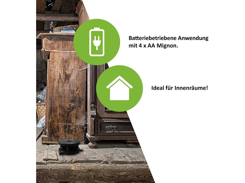 batériami napájaný odpudzovač myší, kún a hlodavcov Inovatívne mobilné zariadenie na proti kunám a myšiam vysiela frekvenciu na všetky strany (360 °) a maximalizuje tak účinok. Plašič na kuny / myši so zvukovým signálom. Zariadenie odosiela v intervaloch cca. 5 sekúnd zapnutý a 25 sekúnd vypnutý, akustický signál. Frekvencia 12 - 24 kHz má nepríjemný vplyv na zvieratá, ako sú myši, kuny a iné hlodavce. Napájanie: 4xAA (sú súčasťou balenia) Chránená oblasť: 40m²-