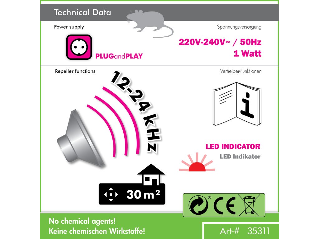 Zariadenie funguje na elektrickú energiu a jeho spotreba je iba 1 W, čím zaručuje dlhodobú a úspornú prevádzku. LED indikácia signalizuje správne fungovanie prístroja a pomáha kontrolovať jeho stav. Frekvenčný rozsah 12–24 kHz zabraňuje škodcom, aby si na zvuk zvykli.
