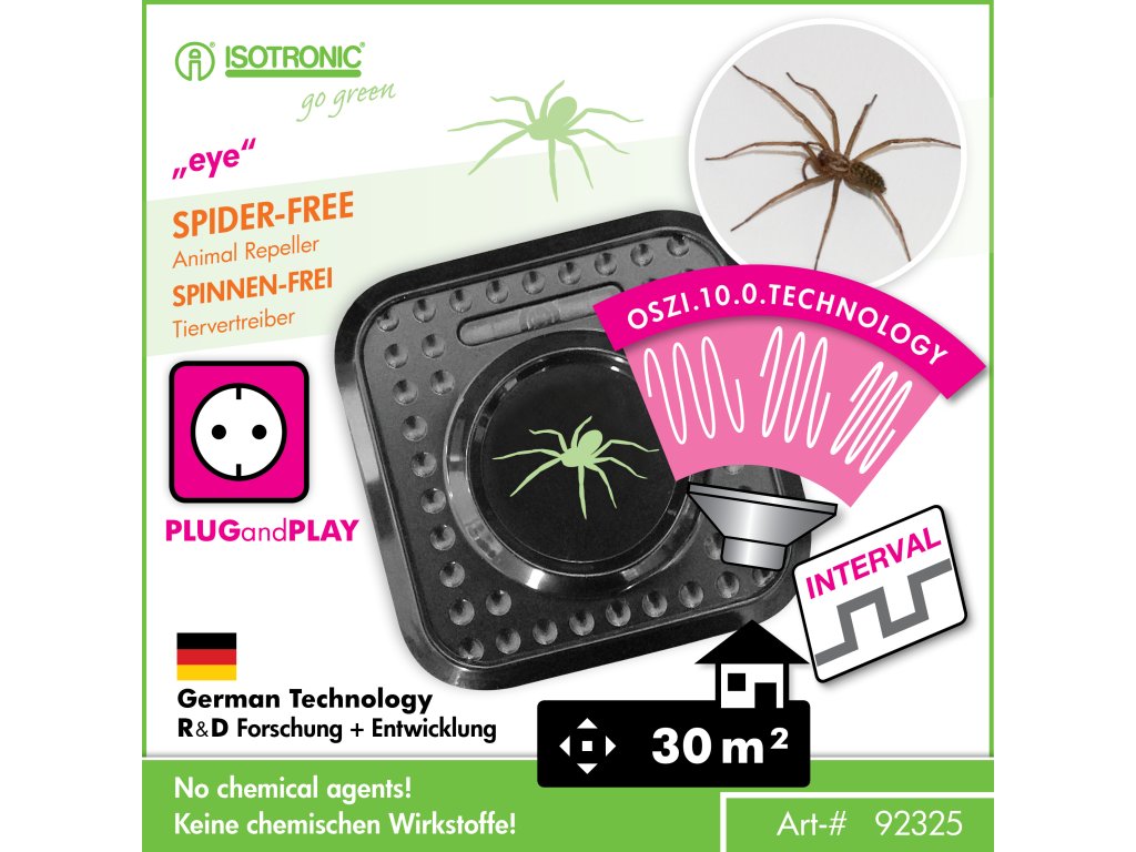ISOTRONIC odpudzovač pavúkov využíva ultrazvukové frekvencie, ktoré narúšajú ich správanie a zabraňujú im zdržiavať sa v chránenom priestore. OSZI.10.0.TECHNOLÓGIA zabezpečuje pulzujúce zvuky každých 6 sekúnd, čím odrádza pavúky od usídlenia v interiéri. Zvukové vlny nepočujú ľudia ani domáce zvieratá, takže používanie zariadenia je bezpečné.