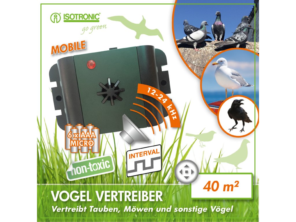 ISOTRONIC odpudzovač vtákov využíva ultrazvukové frekvencie, ktoré efektívne odrádzajú vtáky od usídlenia v chránenom priestore. Prístroj pracuje na batérie, takže ho môžete umiestniť kdekoľvek bez potreby elektrického napájania. Vysokofrekvenčné tóny sú nepočuteľné pre ľudí, no pre vtáky vytvárajú nepríjemné prostredie, ktoré ich núti hľadať si nové miesto.