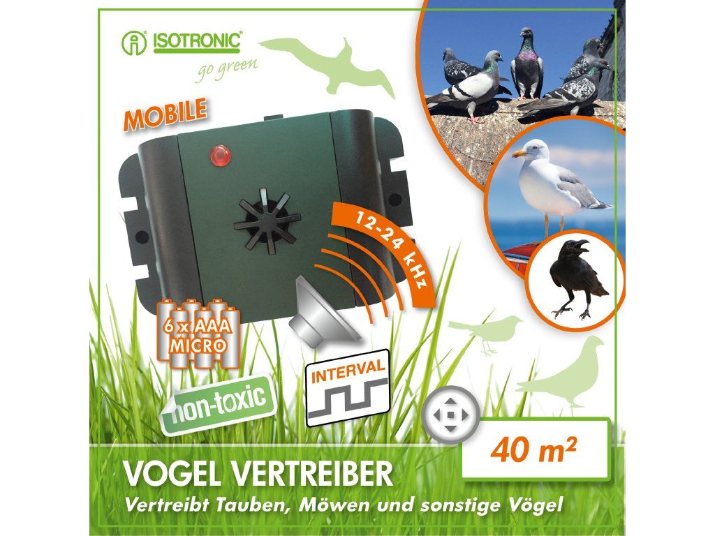 Ultrazvukový odpudzovač holubov a vtákov ISOTRONIC je mobilné zariadenie na ochranu domu, balkóna, záhrady alebo sadu pred nežiaducim vtáctvom. Prístroj vysiela vysokofrekvenčné zvuky v pravidelných intervaloch, ktoré sú pre ľudí takmer nepočuteľné, ale vtákom spôsobujú nepríjemné prostredie. Zariadenie funguje na batérie, takže ho môžete jednoducho umiestniť kdekoľvek bez potreby elektrickej zásuvky.