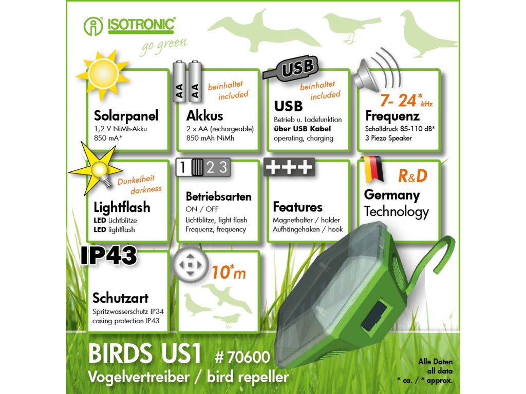 ISOTRONIC solárny odpudzovač vtákov spoľahlivo udržiava holuby, čajky a iné vtáky mimo vašej záhrady, viníc či sadov. Zariadenie kombinuje ultrazvukové signály (24 – 65 kHz) a svetelné efekty, čím vytvára nepríjemné prostredie pre vtáky a odrádza ich od návratu. Integrovaný magnetický držiak a výklopný háčik umožňujú jednoduché a flexibilné upevnenie.