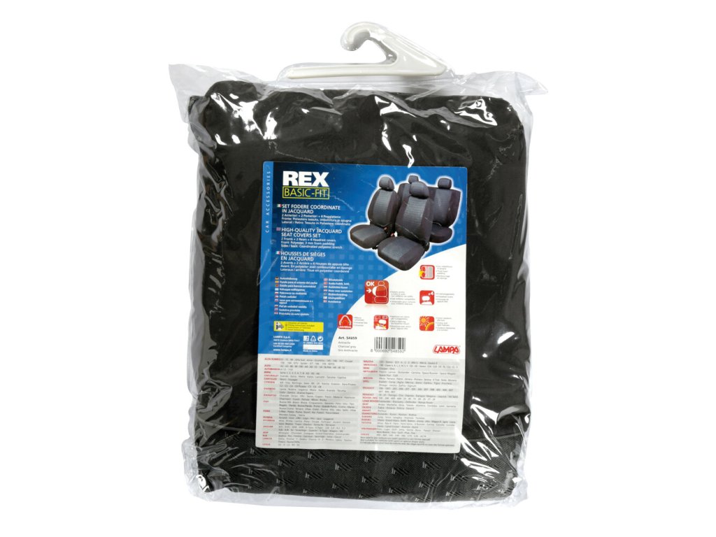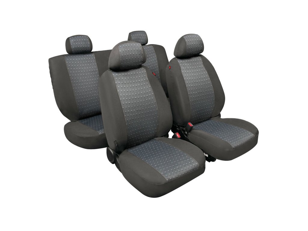 8-dielná sada kvalitných autopoťahov LAMPA REX v šedej farbe 2 predné poťahy, 2 zadné poťahy, 4 poťahov hlavovej opierky.- Univerzálny