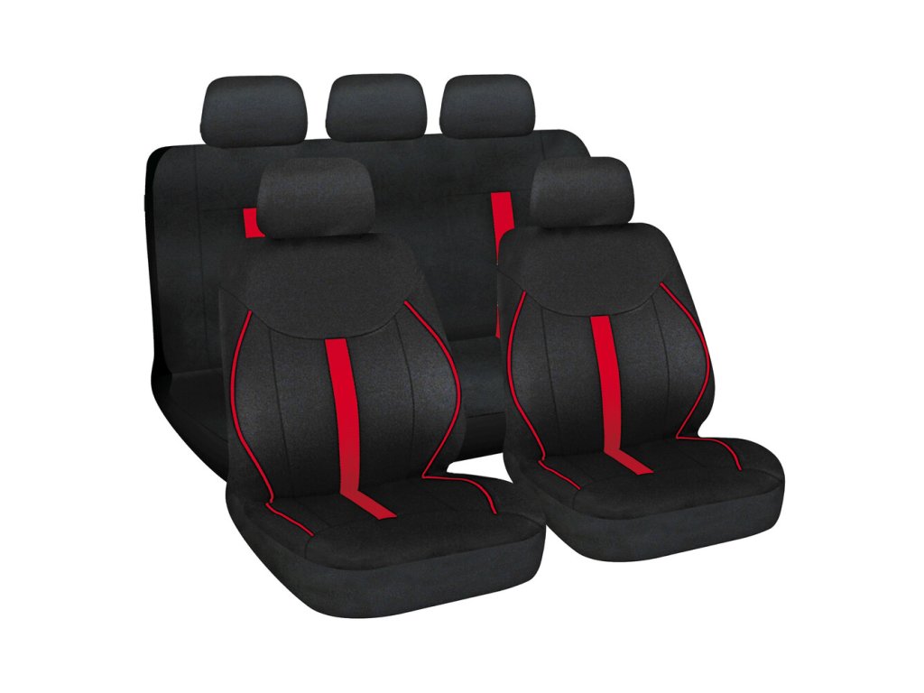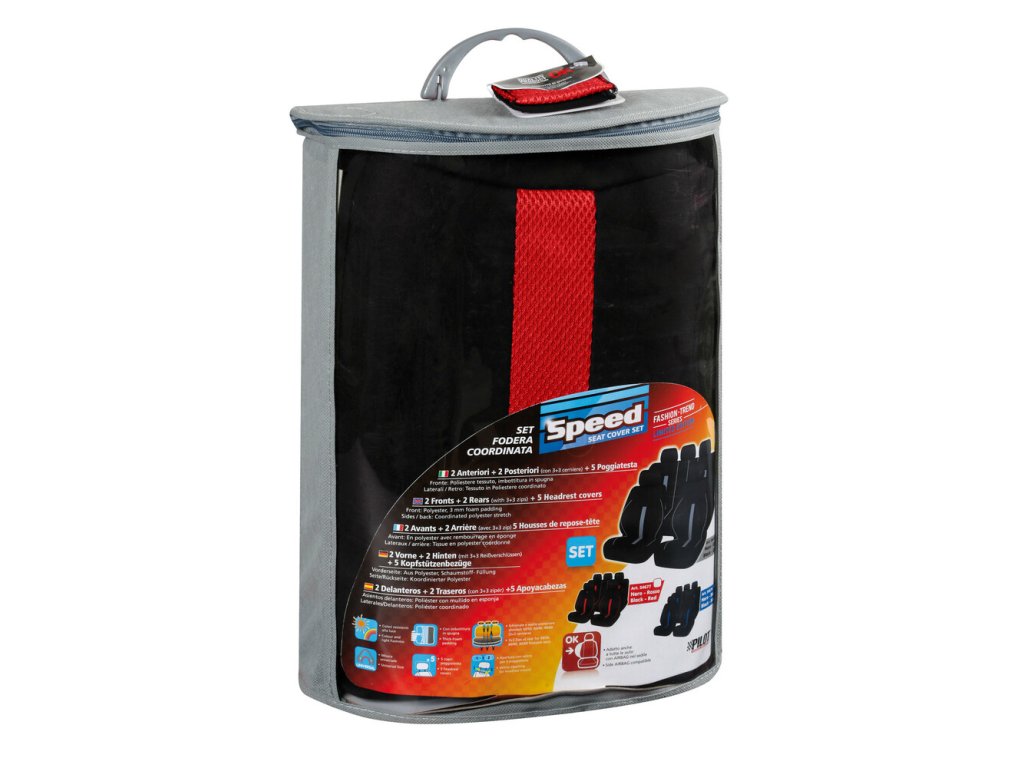 9-dielná sada kvalitných autopoťahov LAMPA SPEED v čiernej farbe s jemným červeným vzorom. 2 predné poťahy, 2 zadné poťahy (s 3 + 3 zipsy), 5 poťahov hlavovej opierky.- Univerzálny