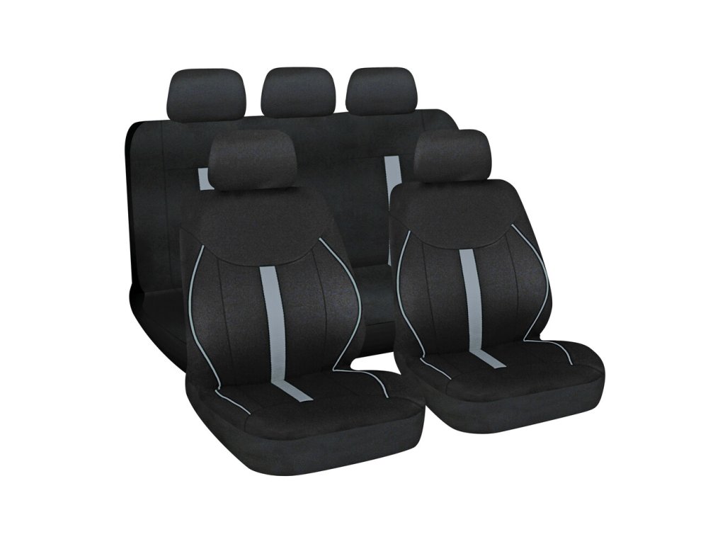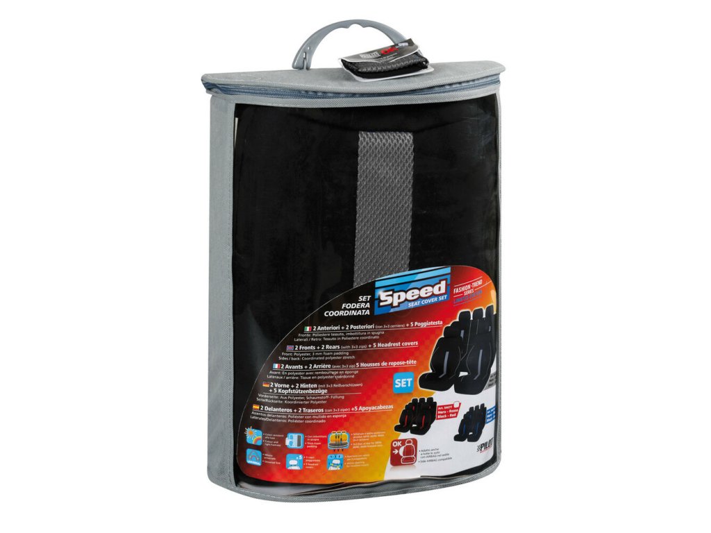 9-dielná sada kvalitných autopoťahov LAMPA SPEED v čiernej farbe s jemným šedým vzorom. 2 predné poťahy, 2 zadné poťahy (s 3 + 3 zipsy), 5 poťahov hlavovej opierky.- Univerzálny