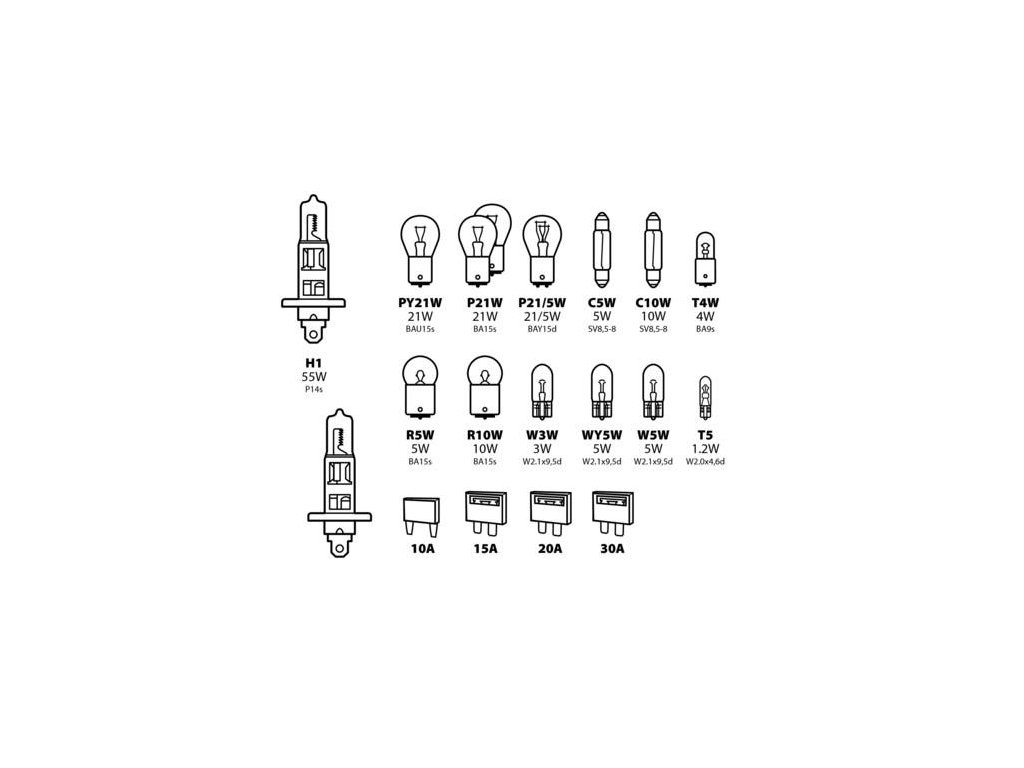 Sada obsahuje: 2ks H1, 1ks P21/5W, 1ks PY21W (oranžová), 1ksC5W, 1ks C10W, 1ks T4W, 1ks R5W, 1ks R10W, 1ks W3W, 1ks W5W, 1ks WY5W, 1ks WT5 a nožové poistky 1ks 10A, 15A, 20A, 25A.