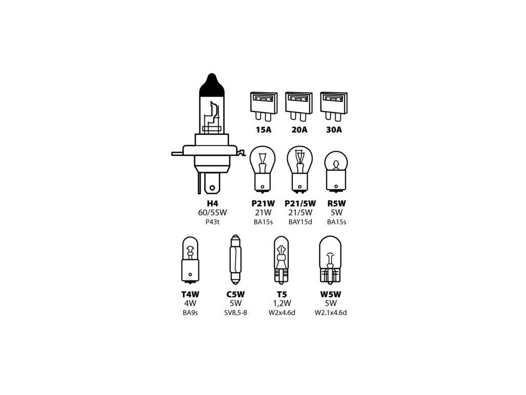 Univerzálna sada autožiaroviek H4 12V Uni Zloženie: 1ks žiarovka H4 1ks žiarovka P21W 1ks žiarovka P21/5W oranžová 1ks žiarovka C5W 1ks žiarovka T4W 1ks žiarovka R5W 1ks žiarovka W5W 1ks žiarovka T5 1ks nožová poistka 15A 1ks nožová poistka 20A 1ks nožová poistka 30A Schválené pre premávku na pozemných komunikáciách.Dodatočné parametre