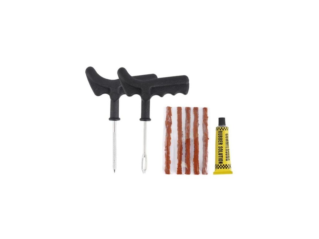 Obsahuje : výstružník s rúčkou, zastrkovač s rúčkou, gumový cement, záplaty Návod : odstráňte predmet ktorý spôsobil prepichnutie pneumatiky. Pomocou výstružníka s rúčkou vyčistite dieru. Vložte záplatu do očka zastrkovača. Naneste vrstvu gumového cementu na záplatu aj do diery na pneumatike. Vopchajte záplatu do diery pomocou zstrkovača. Po vytiahnutí nástroja sa záplata prilepí na miesto vpichu. Po zaschnutí použite ľubovoľný orezávač na odstránenie zvyšku záplaty ale nechajte cca 3mm trčať.Dodatočné parametre