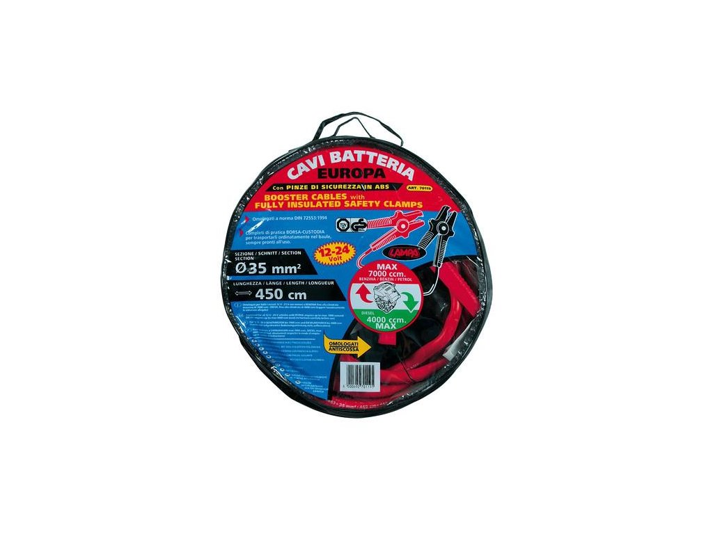Dĺžka 4,5 metra. V uzatvárateľnom obale. Neobsahuje žiadne prísady iných kovov, ktoré znižujú účinnosť štartovacích káblov. Použitie pre benzínové motory do objemu 7000 cm3, dieselové motory do 4000 cm3. DIN 72553 a posilňovacie káble schválené spoločnosťou GS-TÜV Návod na použitie: Spoj každým káblom rovnaké póly na akumulátoroch pomocného vozidla i vozidla ktoré je potrebné naštartovať. Keď sa nechajú káble chvíľu pripojené, oživí sa akumulátor vozidla, ktoré chceme naštartovať. Môžeš štartovať vozidlo okamžite po pripojení. Upozornenie: Venuj pozornosť riadnemu spojeniu klieští s pólmi batérie. Samotné káble a kliešte majú dostatočný prierez na prechod aj vyššieho prúdu ako je uvedený maximálny prúd. Kritickým miestom s najmenšou priechodovou plochou a z toho dôvodu aj miestom s najväčším elektrickým odporom býva práve dotykové miesto klieští s pólmi batérie. Pri veľmi malej ploche vzniká v tomto mieste veľký prechodový odpor s následným prehriatím a je možný aj vznik elektrického oblúka, ktorý poškodí miesto dotyku.Dodatočné parametre
