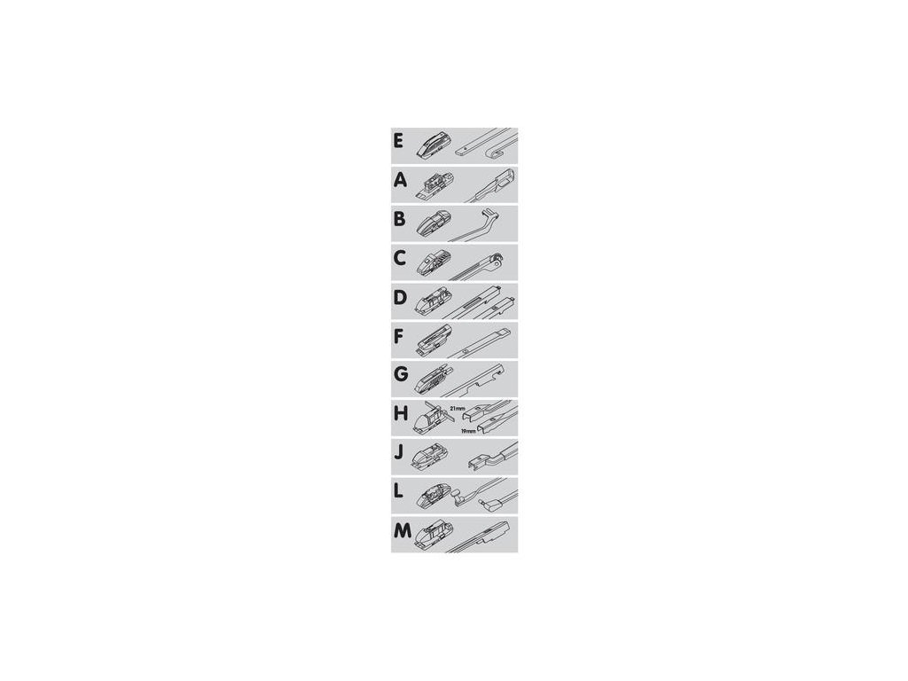 Hybridná technológia spája v sebe výhody klasického a plochého (bezramienkového) stierača. Môže byť použitý na výmenu jedného aj druhého typu. Univerzálny stierač so 7 adaptérmi. Adaptéry B+D+F+G+H sú určené na automobily originálne vybavené bezramienkovými stieračmi. Univerzálny adaptér je určené na všetky autá, ktoré sú vybavené klasickými stieračmi. Aerodynamický dizajn, výborné stieracie vlastnosti, silný plastový rám, špeciálna gumička. Tabuľka veľkostí pre stieračeVýrobca | Model | Ročník | Adaptér |