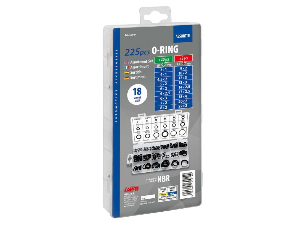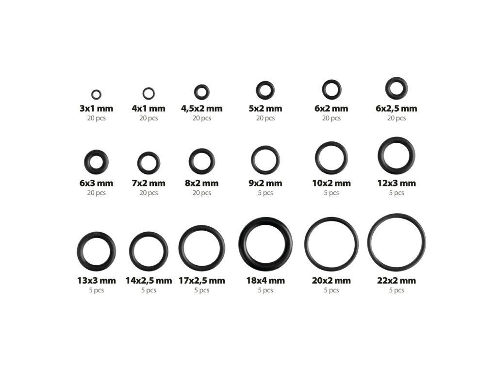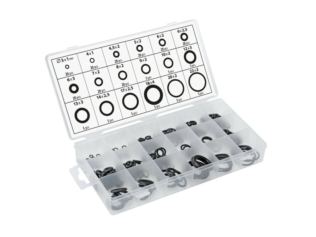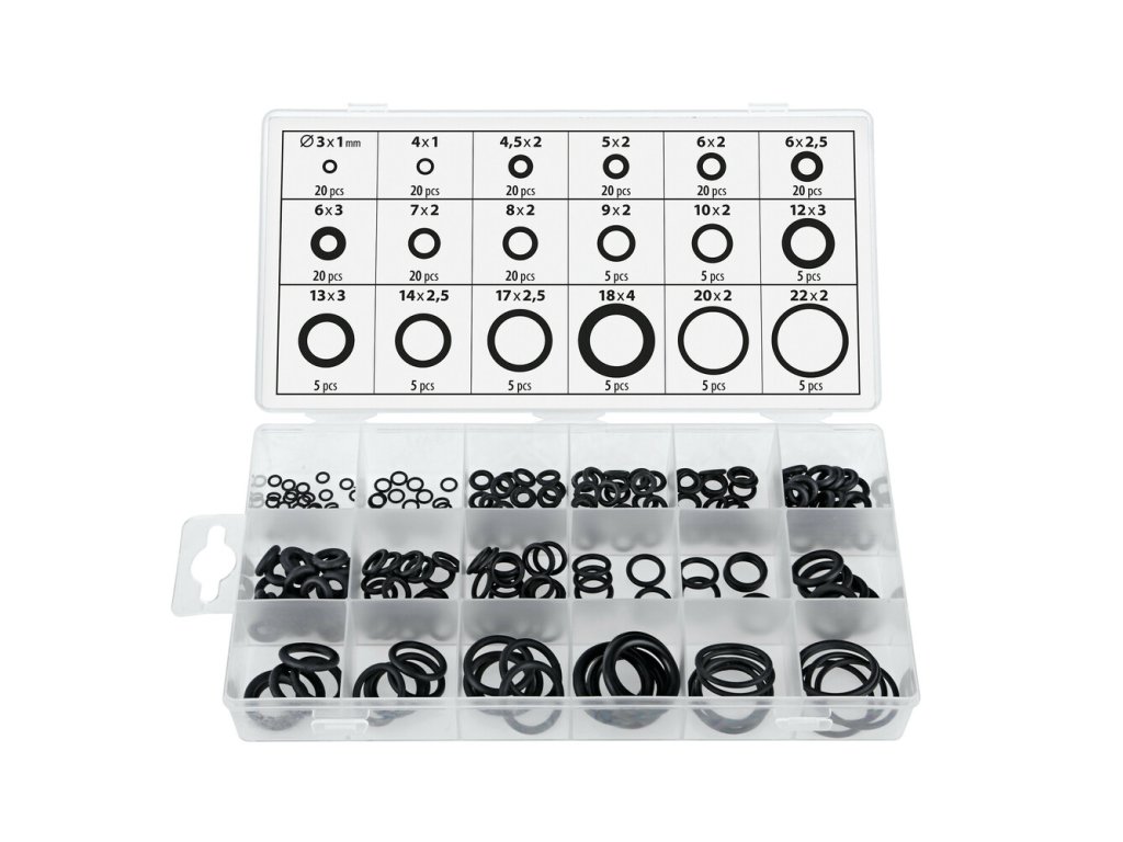 Tesniace krúžky - 18 veľkostí. Táto praktická sada obsahuje 225 tesniacich krúžkov z kvalitného nitrilového kaučuku (NBR), rozdelených do 18 najpoužívanejších veľkostí. Hodí sa do dielne, garáže aj domácnosti – všade tam, kde potrebuješ spoľahlivé utesnenie.