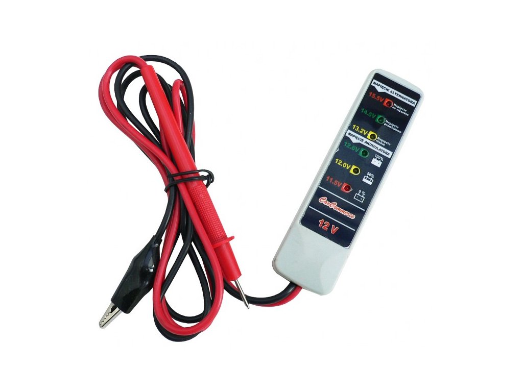 Tester akumulátora a alternátora 12V E61516 Zariadenie slúži na meranie napätia alternátora a aktuálneho napätia akumulátora. Alternátor: meranie je optimálne pri min. 2000 otáč. po dobu 2 min. Červená dióda—príliš vysoké napätie (nutné navštíviť servis) Žltá dióda - príliž nizke napätie ( nutné navštíviť servis) Zelená prípadne žlto zelená - optimálne napätie Akumulátor: Testuje sa za vypnutého motora. Červená dióda - príliš nízke napätie nutné dobiť akumulátor Červená +žltá dióda - nizke napätie nutné dobiť akumulátor Červená +žltá + zelená - optimálne napätie akumulátor je plne funkčný Káblové svorky : červený +pol čierny –polDodatočné parametre