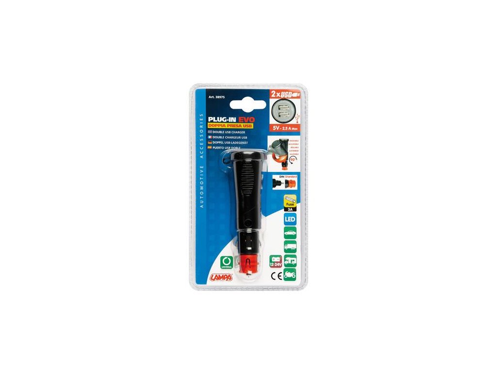 Zástrčka zapaľovača univerzálna 12 -24 s nabíjačkou USB 2 x, LED kontrolkou a 3 A bezpečnostnou poistkou. Polohovateľná 90° Rozmery: VSTUP ---> 12/24 V - Standard VÝSTUP ----> 2 x 5 V - USB - 2,5 A totalDodatočné parametre