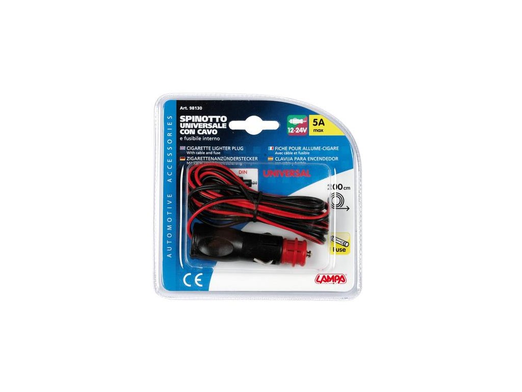 Zástrčka zapaľovača univerzálna 12 -24 V s káblom a poistkou Rozmery: VSTUP ---> 12/24 V - Standard VÝSTUP ----> kábel 200 cm - 5 ADodatočné parametre